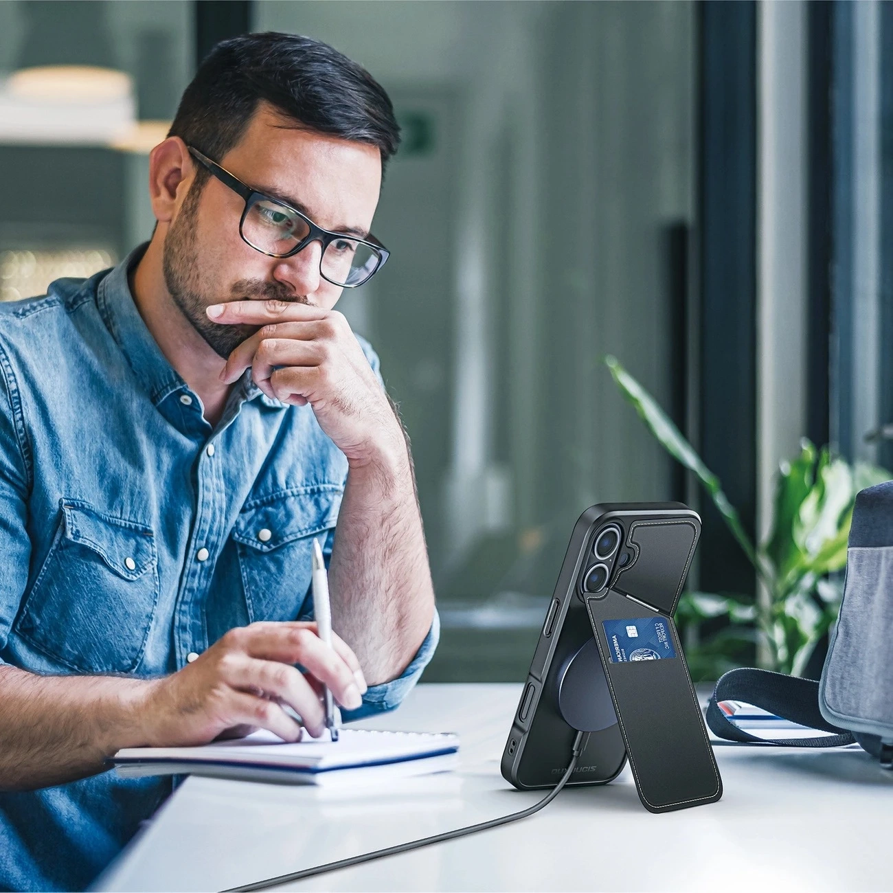 • Чохол Dux Ducis Rafi II Mag для iPhone 16 підтримує зарядку MagSafe, має вбудований гаманець для двох карток із RFID-блокуванням та підставку. Він захищає екран, камеру та забезпечує міцний захист від ударів.