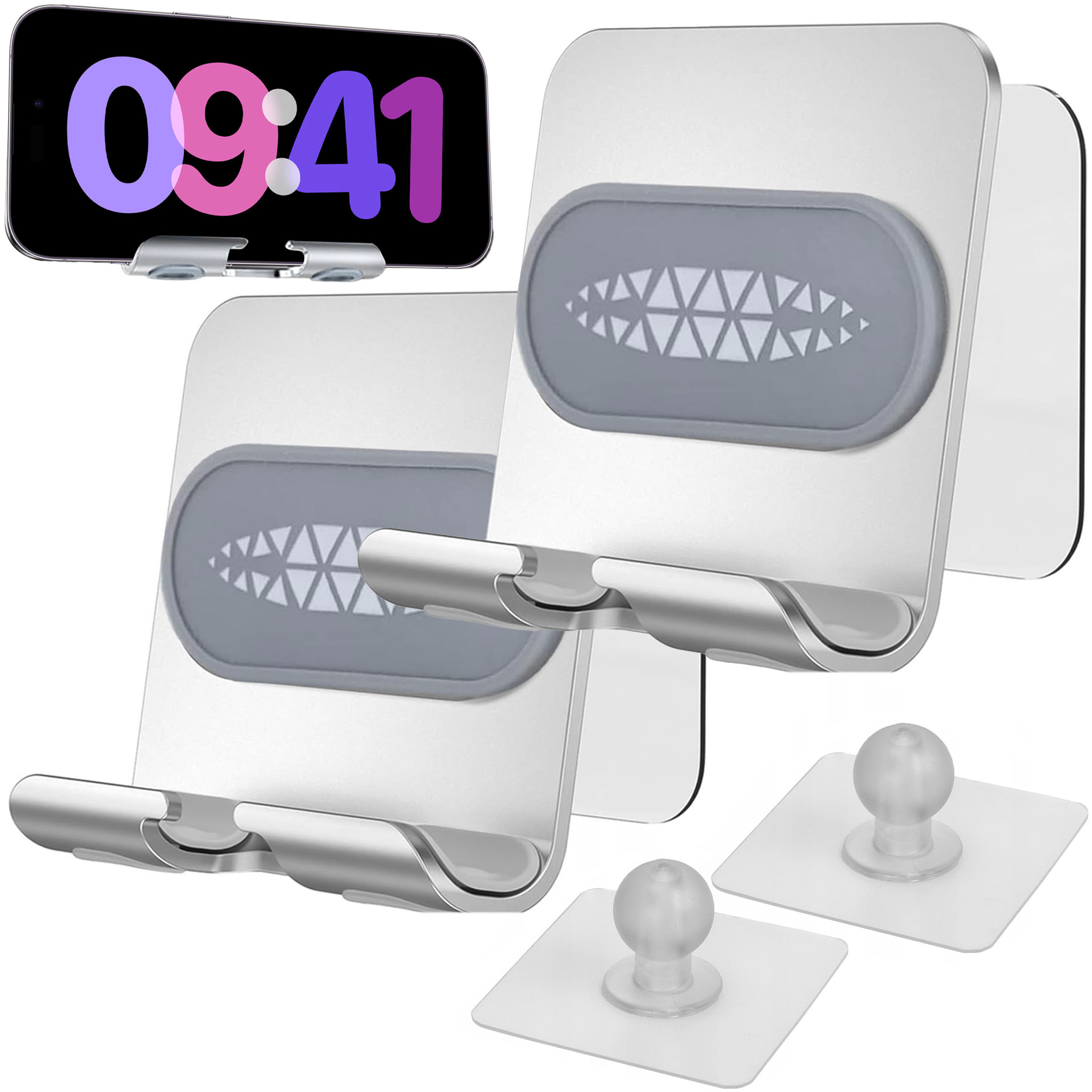 Držák se montuje pomocí silikonu pokrytého silným lepidlem, což umožňuje instalaci na různé povrchy, jako jsou hladké stěny, dlaždice, sklo, dřevo nebo kov. Díky tomuto montážnímu systému lze držák snadno namontovat téměř kamkoli bez nutnosti vrtání nebo použití nářadí,