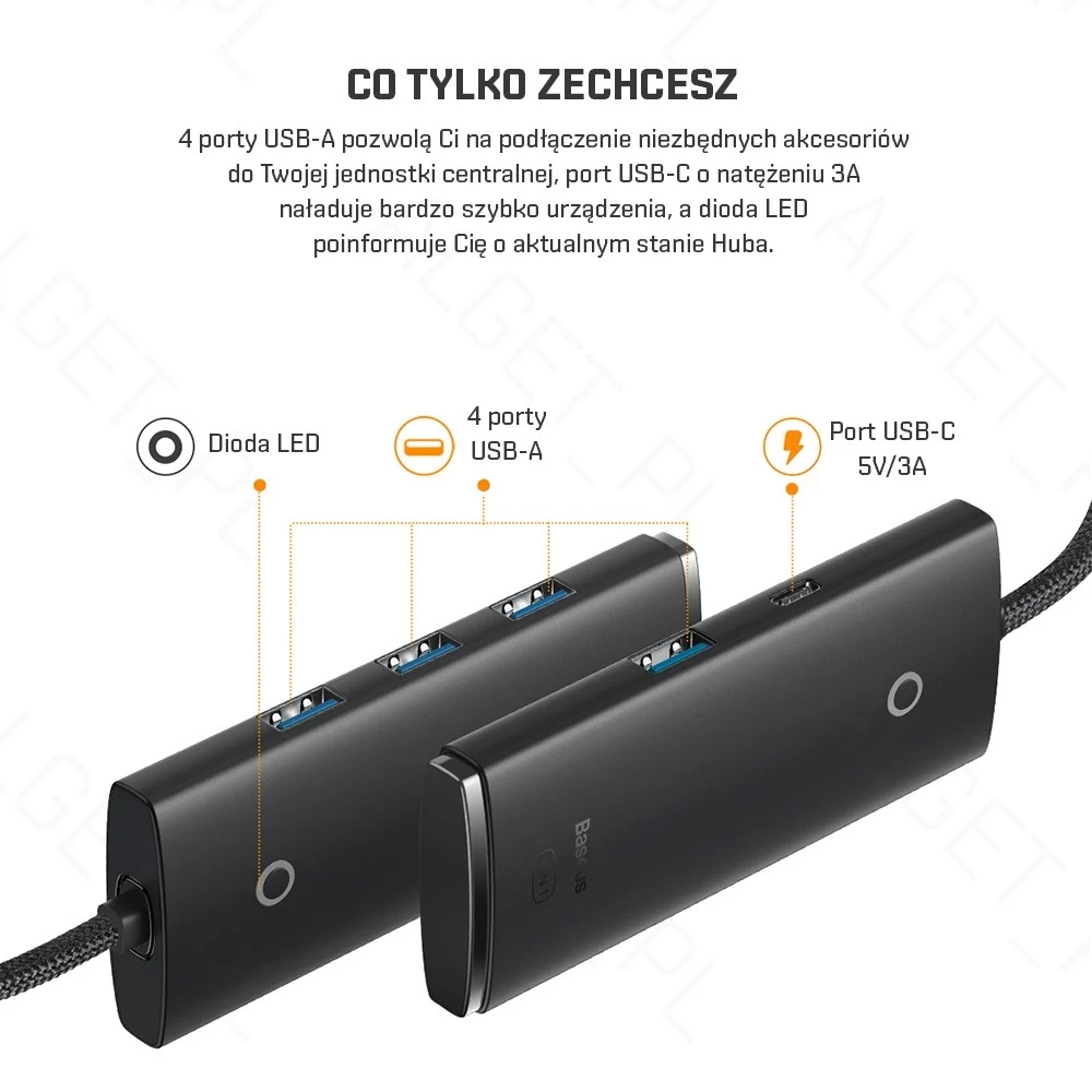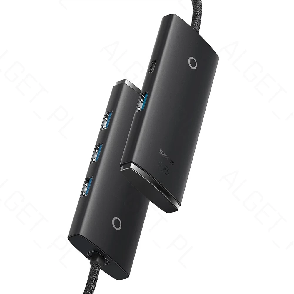 Rozbočovač Baseus Lite Series umožňuje rozšířit počet portů USB-A, což je užitečné zejména pro zařízení s omezeným počtem. Díky tomuto řešení můžete rozšířit možnosti svého notebooku nebo počítače o další 4 USB-A 3.0 porty. Toto rozhraní podporuje přenosové rychlosti až 5Gb/s, což umožňuje extrémně rychlý přenos dat s možností přenosu až 500MB/s. Lehký design adaptéru z něj dělá skvělého společníka na cesty. K příslušenství lze připojit mnoho zařízení, jako je tiskárna, čtečka karet, mobilní telefon, iPod, USB flash disk, myš, klávesnice nebo externí pevný disk (maximálně 4 TB). Náboj Baseus je vyroben z odolného ABS materiálu, který zaručuje dlouhodobé používání, kabel je vyztužený nylonovým opletem.
