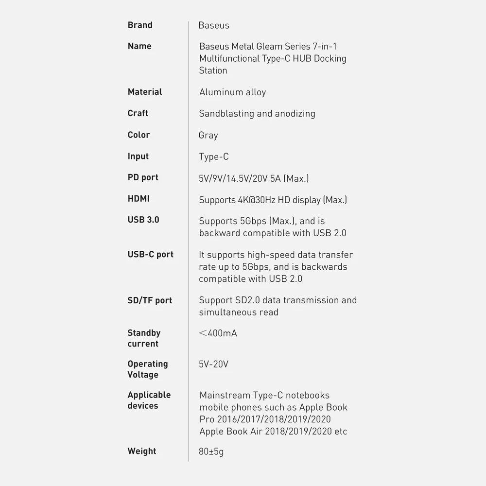 Baseus Metal Gleam Series multifunkční USB HUB 7v1 Type C HDMI TF PD čtečka karet šedá (WKWG020113)
