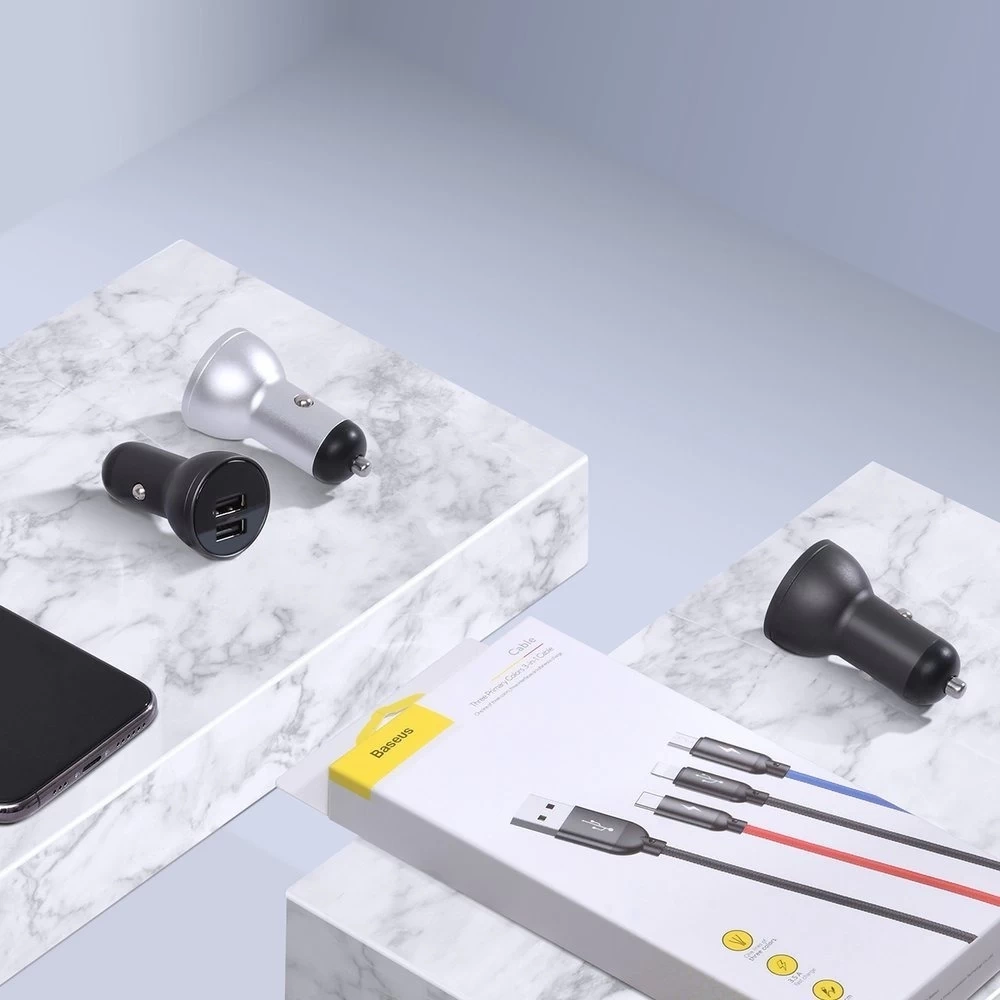 Baseus kit nabíječka do auta 2x USB 4,8A 24W s LCD + 3v1 USB - USB Type C / micro USB / Lightning 1,2m kabel: