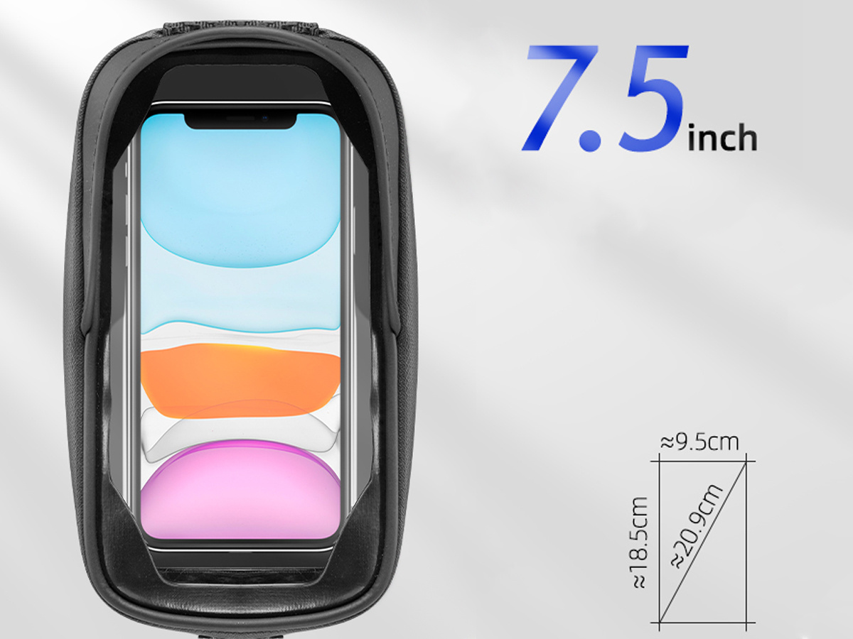 Kufr RockBros je namontován na rámu vedle volantu. Přes speciální, průhledné okénko z citlivého TPU si navíc můžeme navigaci v telefonu vždy prohlédnout, protože je kompatibilní s dotykovým displejem zařízení pod 7,5 palce , aniž bychom ji museli sundávat.
