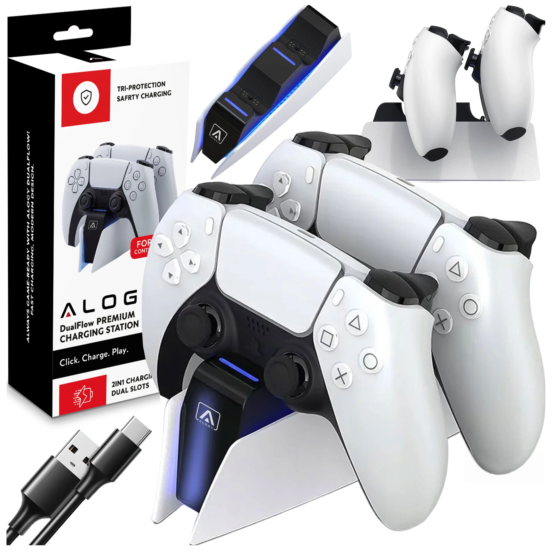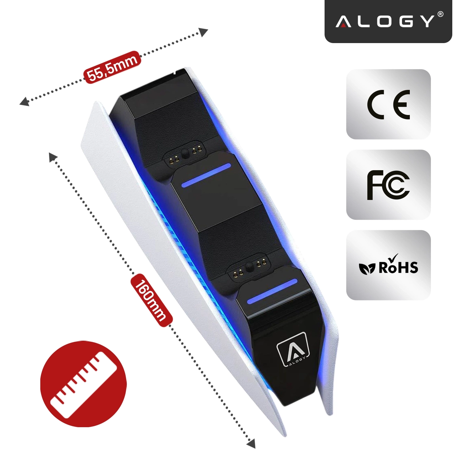 Nabíjecí stanice má LED podsvícení a dvě LED diody, které jsou umístěny před nabíjecími zdířkami. O stavu nabití ovladačů informují LED diody. Modrá barva znamená, že je zařízení plně nabité, a červená barva - nabíjí se. Nabíječka zajišťuje rychlé nabití podložek z konzole, díky čemuž jsou zařízení připravena k použití do 2,5 hodiny. Dokovací stanice má port USB-C typu C a přiložený kabel nám umožňuje připojit zařízení k napájení díky univerzálnímu USB konektoru, který lze připojit mimo jiné k nabíječce, notebooku nebo počítači. .