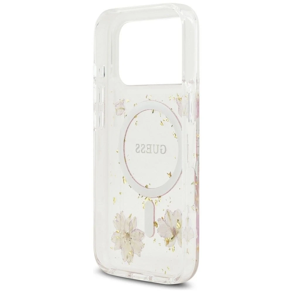 Etui Guess Resin Flowers Glitter MagSafe do iPhone 17 Pro to idealne połączenie ochrony i luksusowego stylu. Wyróżnia się unikalnym designem – różowy kolor, kwiatowy wzór i złote drobinki brokatu tworzą efektowną kompozycję, która przyciąga wzrok i dodaje urządzeniu wyjątkowego charakteru. Centralnie umieszczone logo Guess oraz brokatowy pierścień MagSafe dopełniają całości, czyniąc z etui modny dodatek do telefonu.
