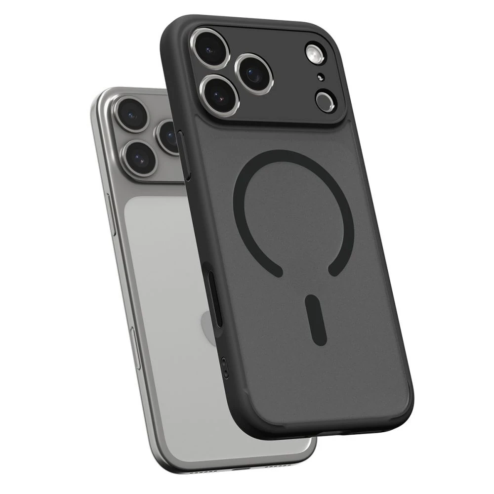 Etui Spigen Ultra Hybrid Mag MagSafe do Apple iPhone 17 Pro Max w kolorze Frost Black to połączenie funkcjonalnej ochrony i eleganckiego designu. Półprzezroczysta konstrukcja z czarnymi akcentami podkreśla nowoczesny wygląd telefonu, zapewniając mu jednocześnie skuteczną ochronę w codziennym użytkowaniu.