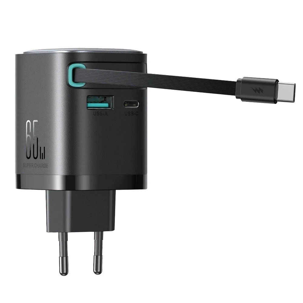 Nabíječka Joyroom JR-TCL02 GaN s výkonem až 65W s konektory USB-A a USB-C a vestavěným kabelem USB-C - černá