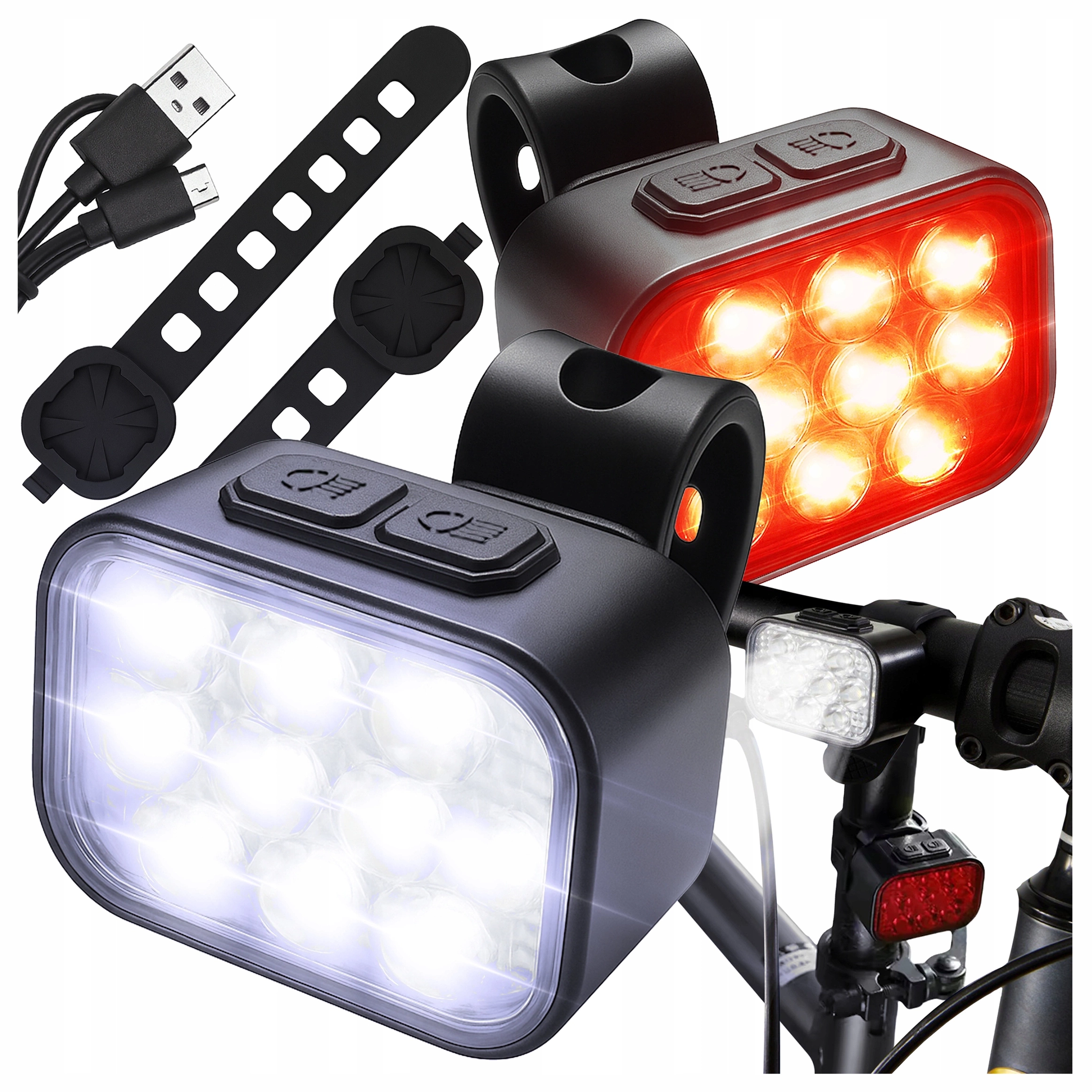 - Sada obsahuje: 1x Přední světlo na kolo, 1x Zadní světlo na kolo, 2x Montážní popruh, 1x Kabel USB-2 USB-C