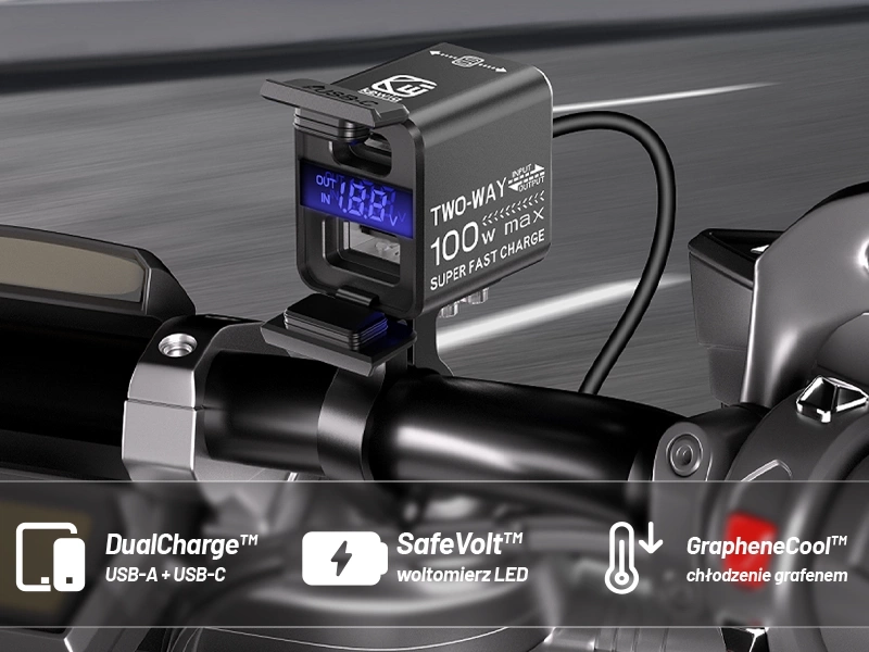 • Univerzální obousměrná hliníková nabíječka na motocykl Kewig B13 s rychlonabíjením 100 W s LED voltmetrem a duálním USB-C USB-A výstupem. Vodotěsnost IP66, s funkcí nabíjení baterie a ochranou proti přehřátí.