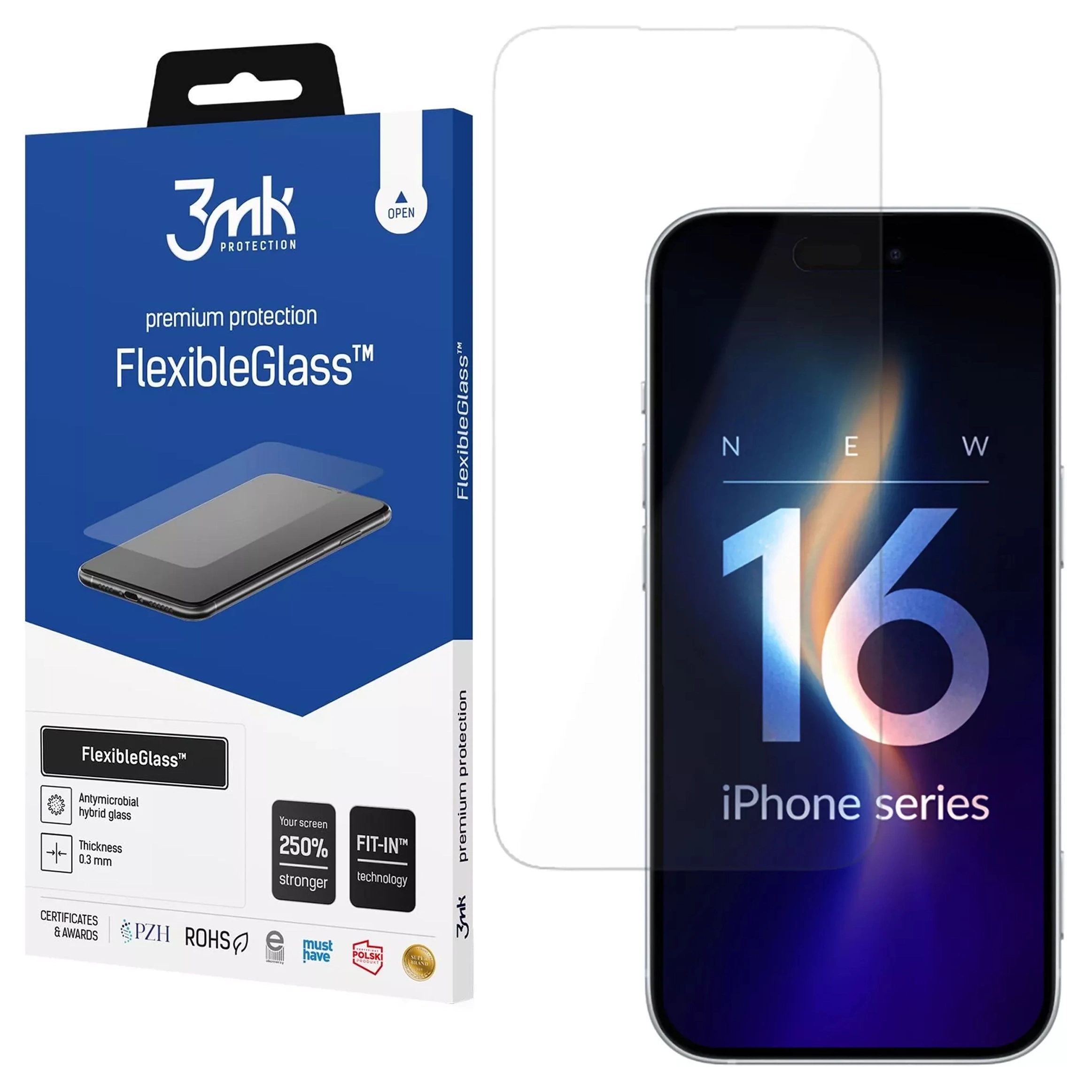 • Nerozbitné hybridní sklo pro Apple iPhone 16 Pro Max 3mk FlexibleGlass ochranné sklo Glass 7h je sklo nové generace. Díky kombinaci nejlepších vlastností fólie a skla je odolný proti prasknutí a zpevňuje displej, čímž zvyšuje ochranu.