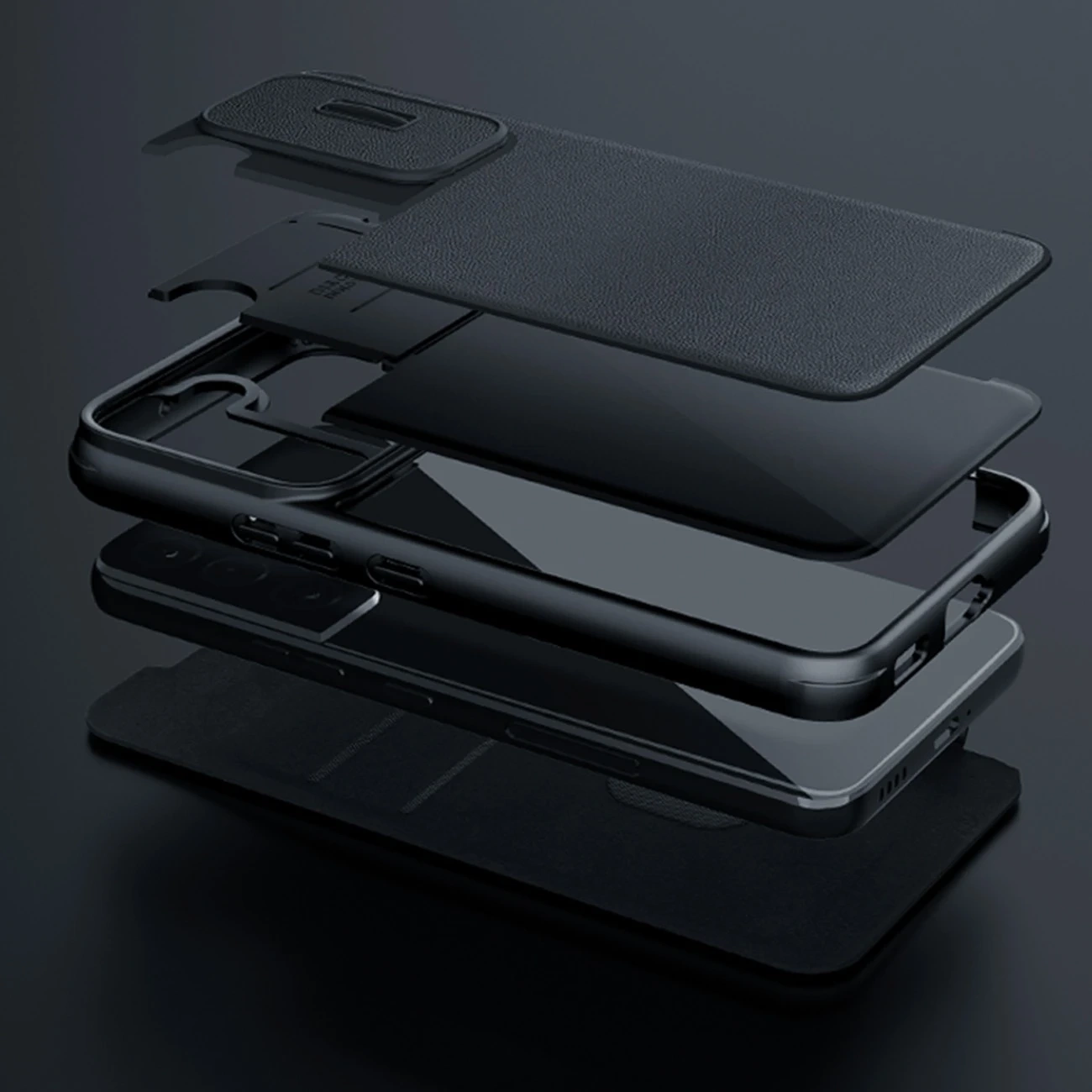 • Pouzdro Nillkin Qin Cloth Pro pro Samsung Galaxy S23 Flip Camera Cover má velmi elegantní, klasický vzhled. Kryt s klopou zabraňuje poškrábání a nečistotám na vašem Samsung Galaxy S23, je také alternativou ke klasickému p