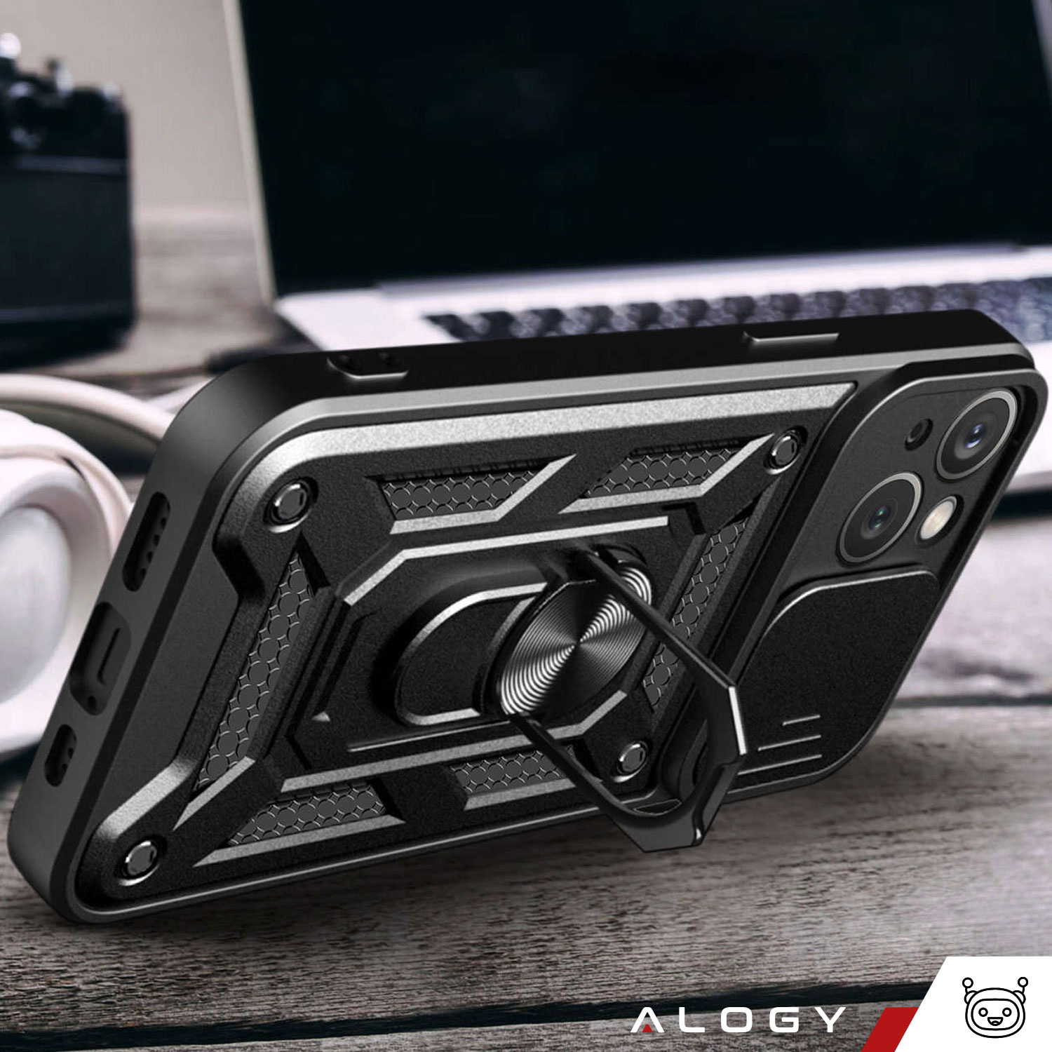 • Pancéřové pouzdro pro iPhone 15 Camshield Case Ring Alogy Stand s posuvným krytem fotoaparátu poskytne vysokou úroveň ochrany. Vyrobeno z tvrdého polykarbonátu a pružného TPU, obohacené o magnetický držák a držák na prst.