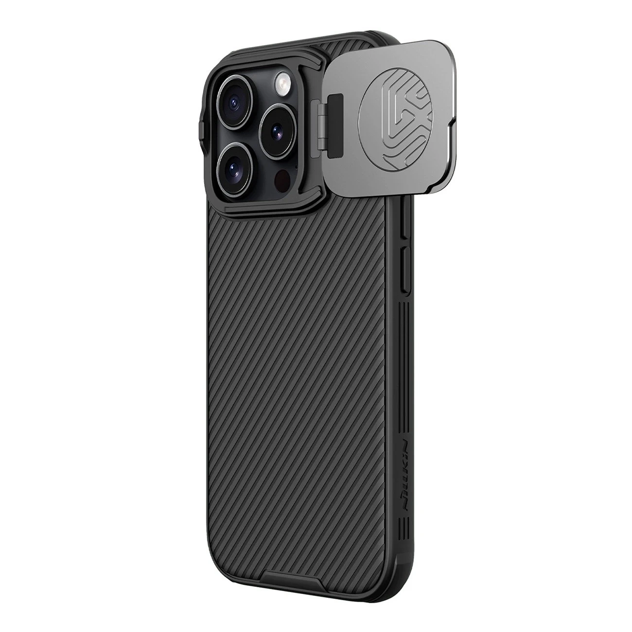 Pouzdro Nillkin CamShield Prop pro iPhone 16 Pro Max s krytem objektivu a funkcí stojánku. Odolné proti nárazům, protiskluzové a proti otiskům prstů. Stylová a praktická každodenní ochrana.