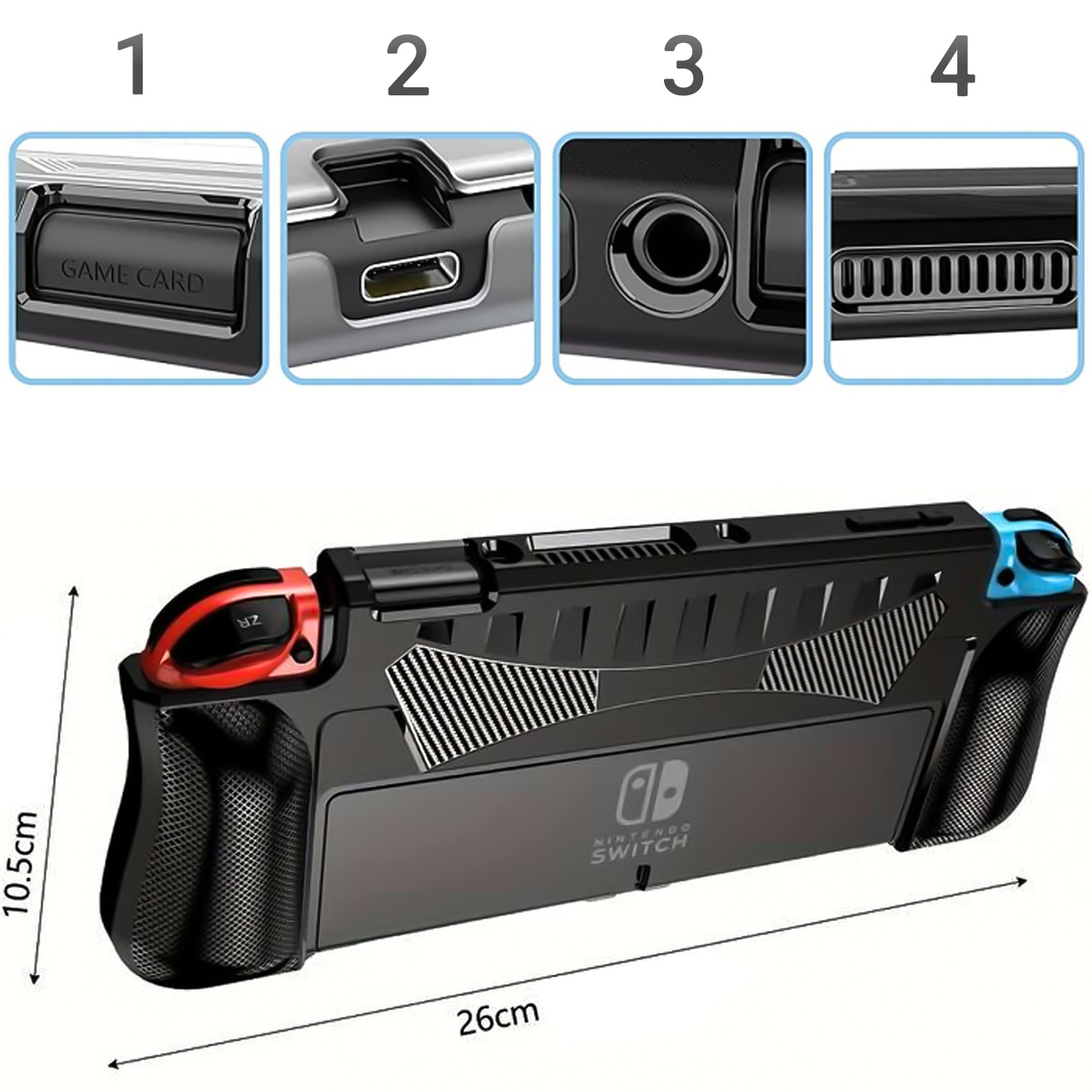 Pouzdro se perfektně hodí k vaší konzoli Nintendo Switch OLED a neztloustne ji. Zadní strana pouzdra je pokryta moderní texturou imitující vzhled uhlíkových vláken, což mu dodává moderní a inovativní charakter.