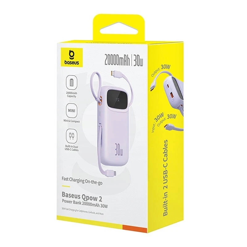Se dvěma porty USB-C, jedním portem USB-A a vestavěným kabelem USB-C vám Baseus QPow 2 umožňuje nabíjet až čtyři zařízení současně. 30W nabíjecí výkon vám umožní rychle nabít smartphony a tablety a dosáhnout až 57 nabití pro iPhone 15 Pro za pouhých 30 minut. Kompaktní design a hmotnost pouhých 360 g usnadňují přepravu a vejdou se do každé tašky. Integrovaný kabel USB-C navíc eliminuje potřebu nosit další kabely.