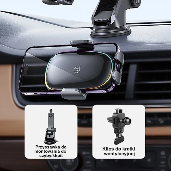 • Uchwyt USAMS US-CD187 z ładowaniem bezprzewodowym Qi 15W. Montaż na szybę, deskę rozdzielczą lub kratkę. Kolorowe podświetlenie LED, mocny zacisk i szeroka kompatybilność z iPhone i Android.