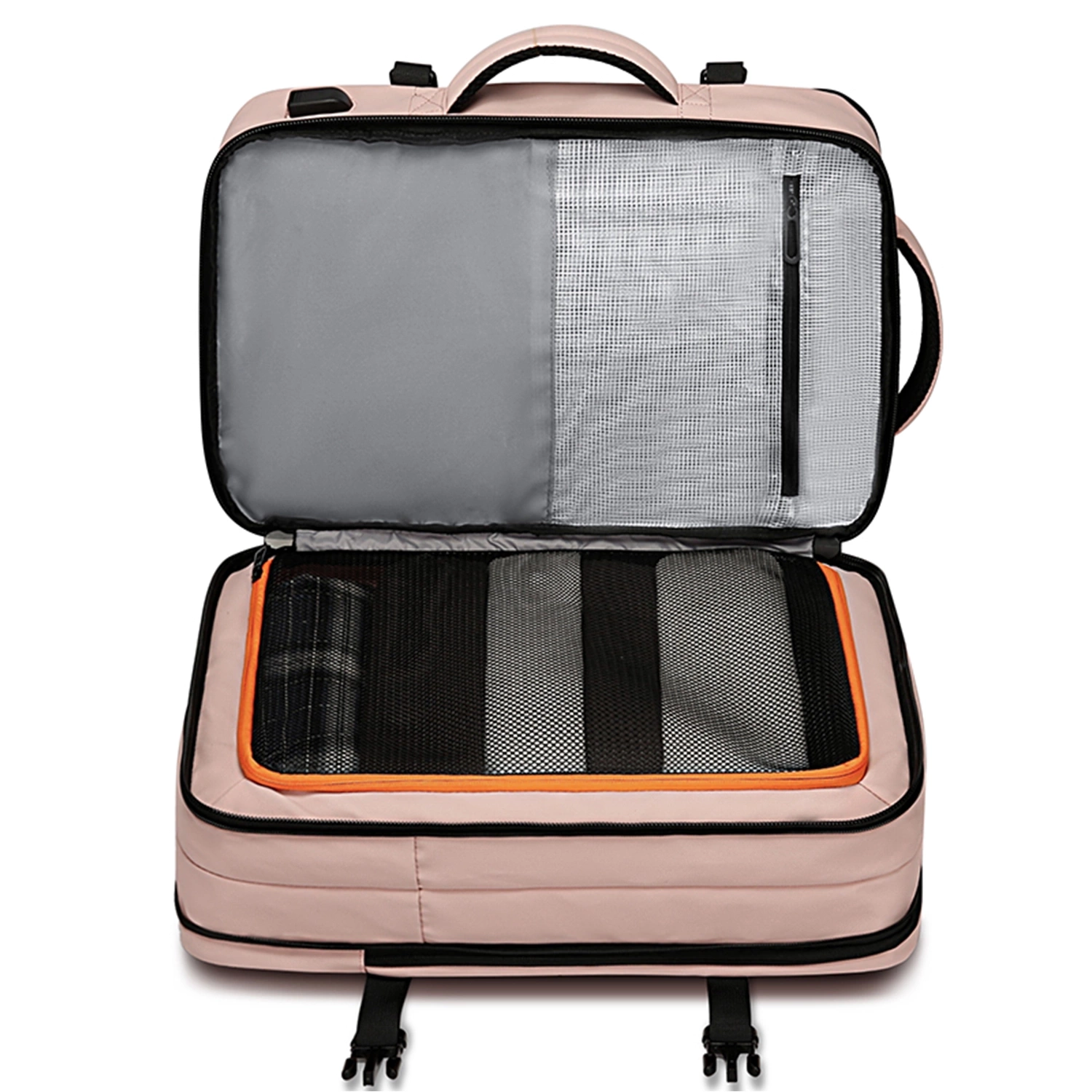 ✅ Hlavní přihrádka batohu se otevírá na zip jako kufr, což umožňuje uložení větších předmětů, jako je oblečení. Má také síťovanou přihrádku a vodotěsnou kapsu na kosmetiku .