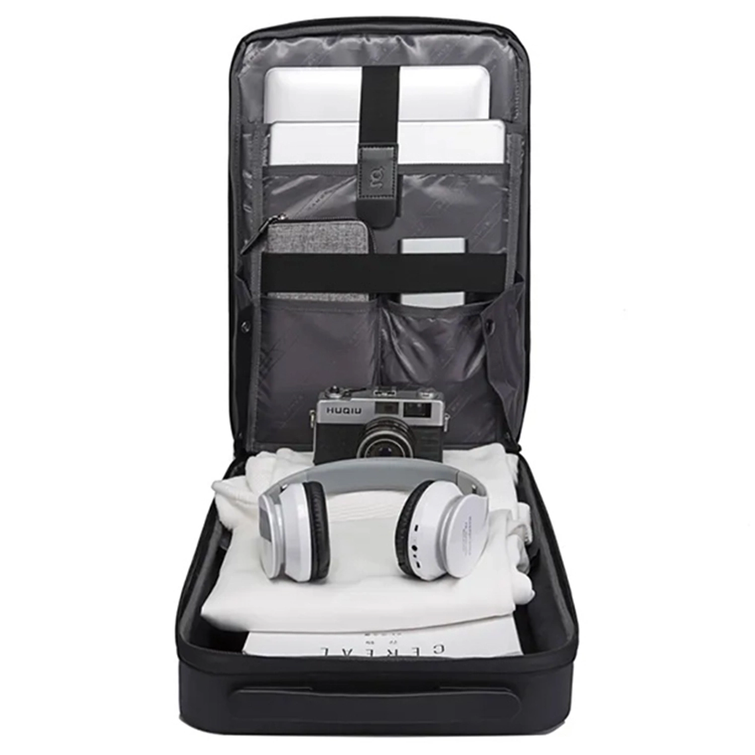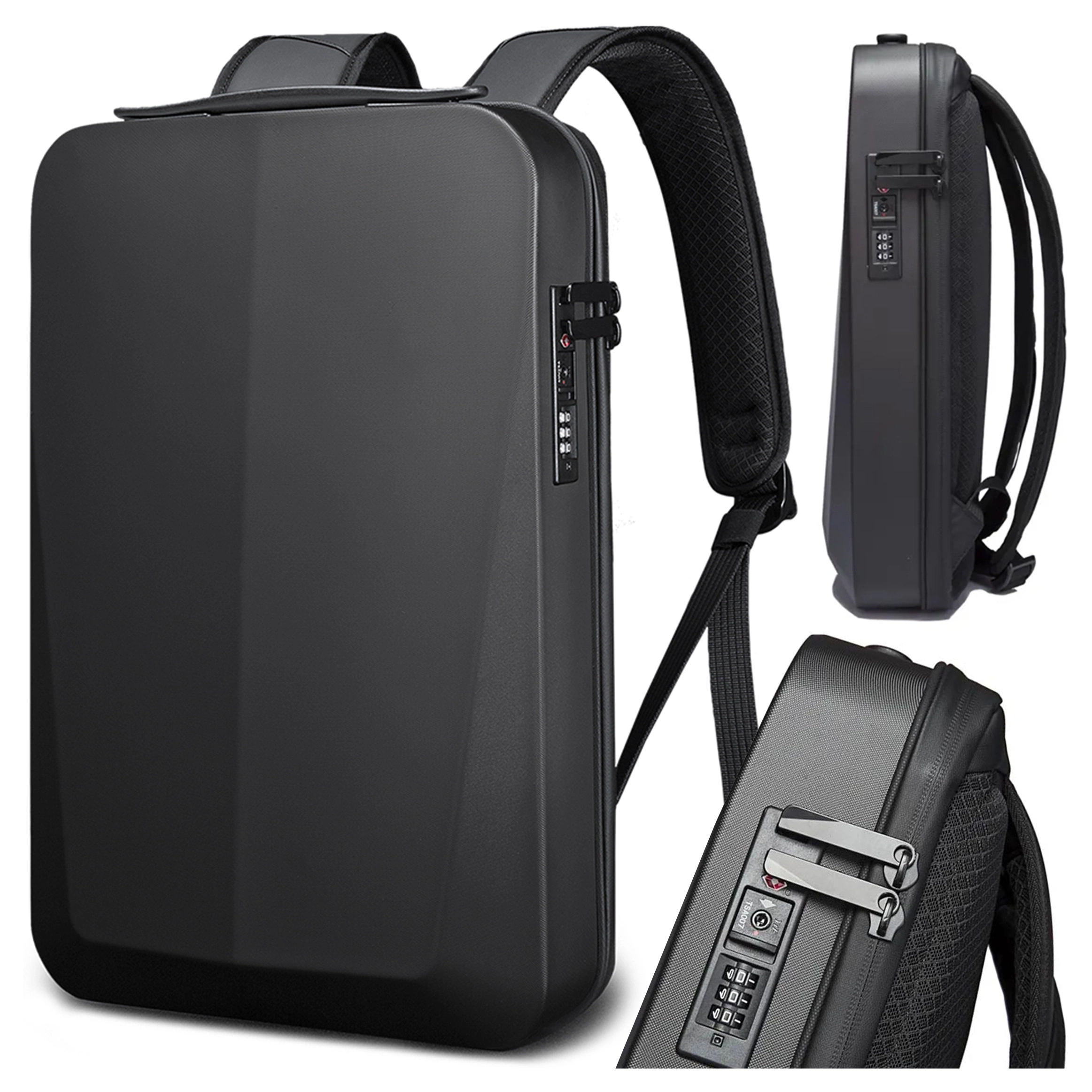 - Vlastnosti: Otevírá se jako kufr, vestavěný USB port, nastavitelné ramenní popruhy, hlavní přihrádka zajištěná kombinačním zámkem