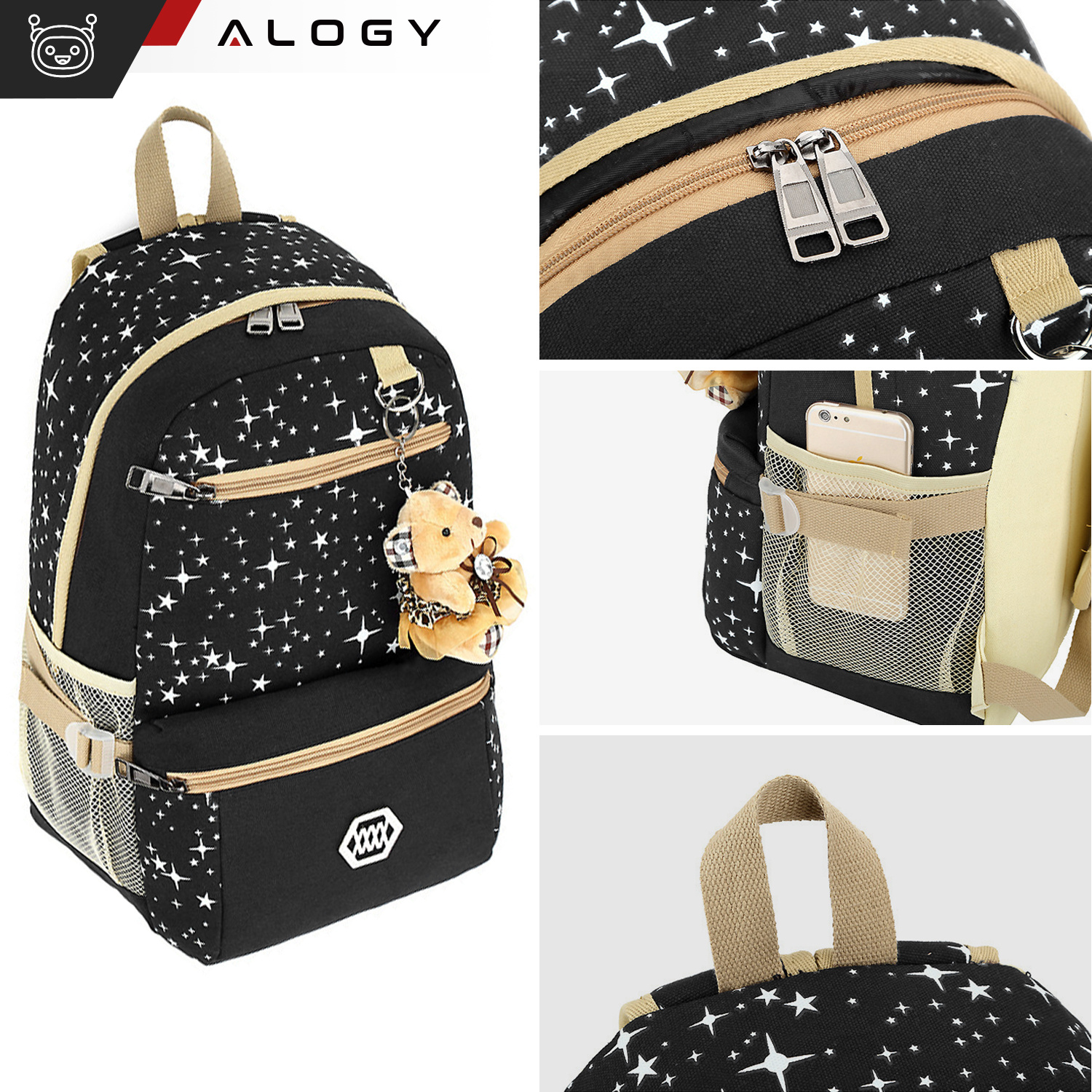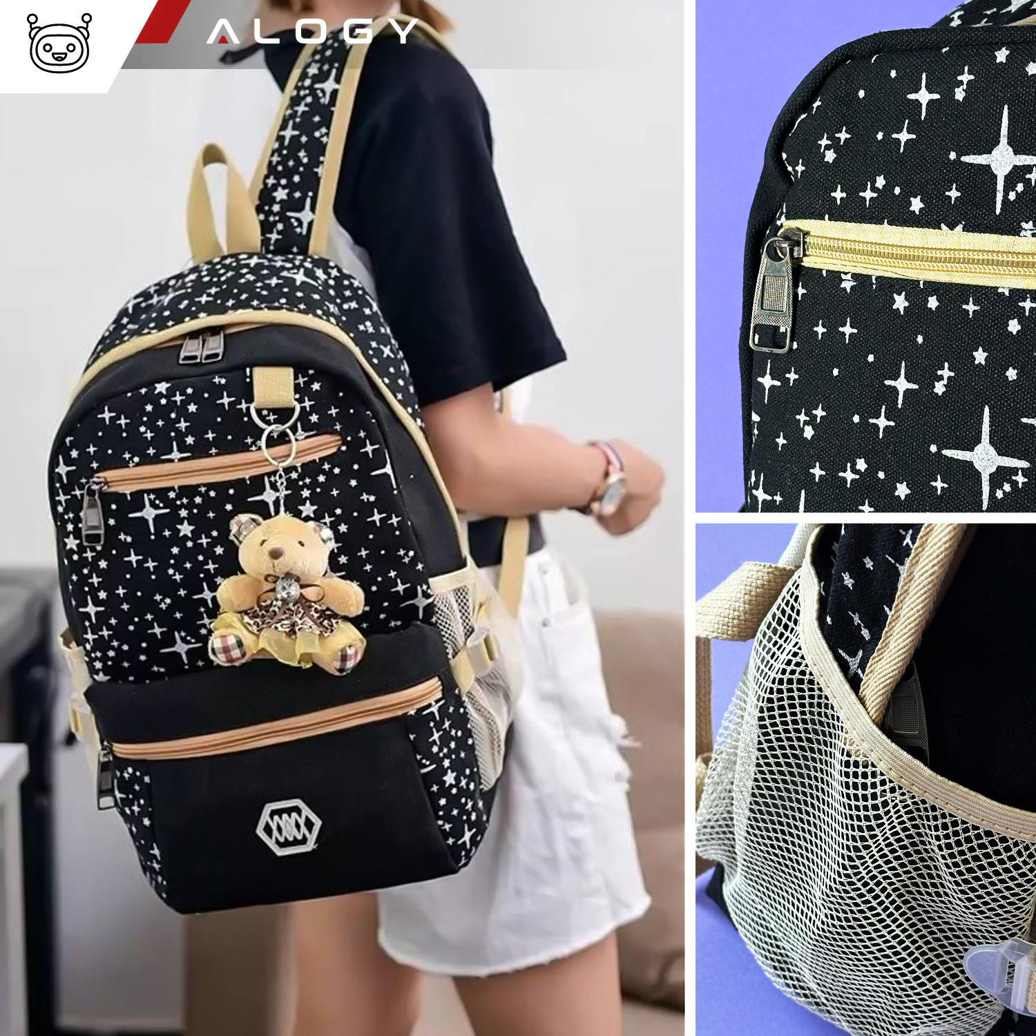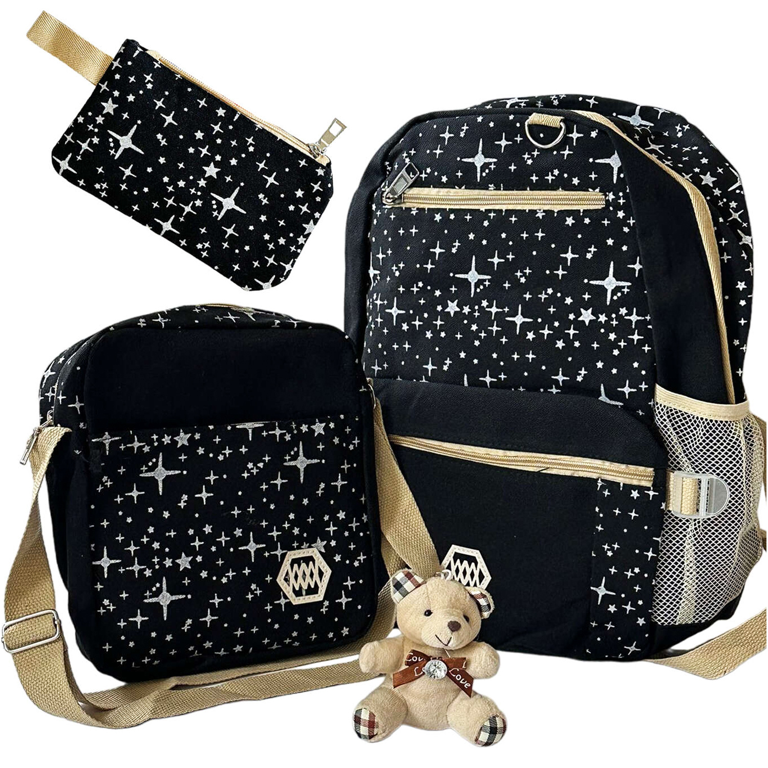 - Inbegriffen: 1x Rucksack, 1x Umhängetasche, 1x Federmäppchen (Kosmetiktasche), 1x Teddybär