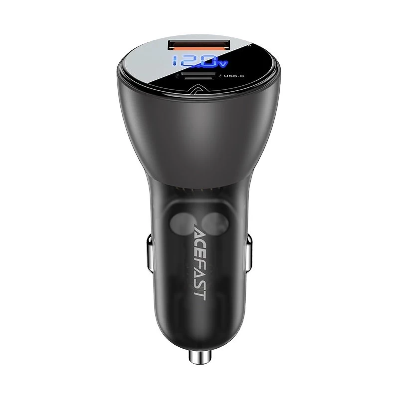 Acefast schnelles Autoladegerät. Es hat 2 Anschlüsse, USB Typ C und USB. Der erste USB-Typ-C-Stecker ermöglicht das Laden mit einer maximalen Leistung von 45 W und ein USB-Stecker mit bis zu 18 W. Ermöglicht u.a. schnelles Aufladen in den Standards PPS, Power Delivery, Quick Charge 3.0, AFC und FCP. Daran können zwei Geräte gleichzeitig angeschlossen werden. Es besteht aus feuerfestem PC-Material. Es wurde mit vielen Schutzfunktionen wie Überhitzung, Überspannung, Hochspannung oder Überlastung ausgestattet.