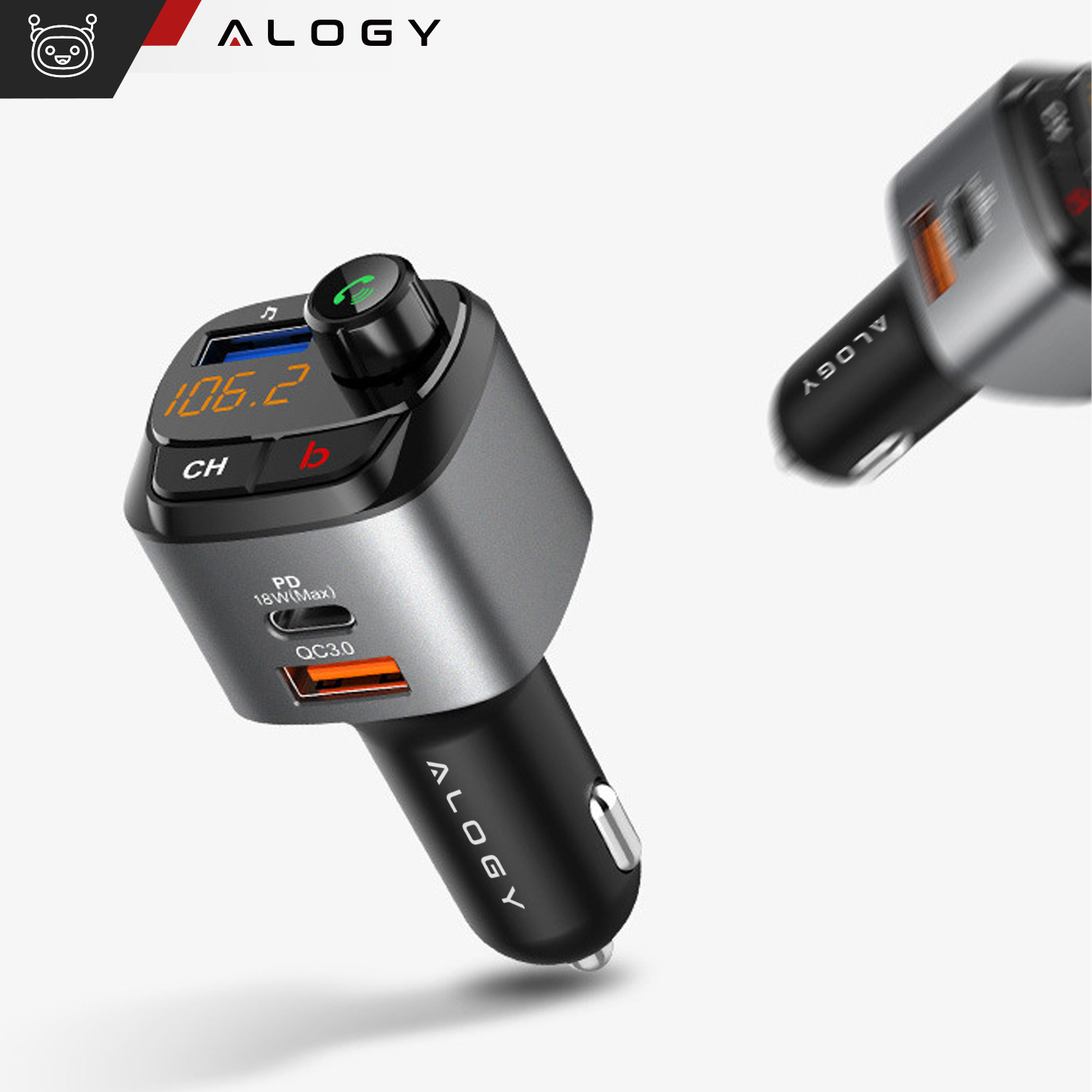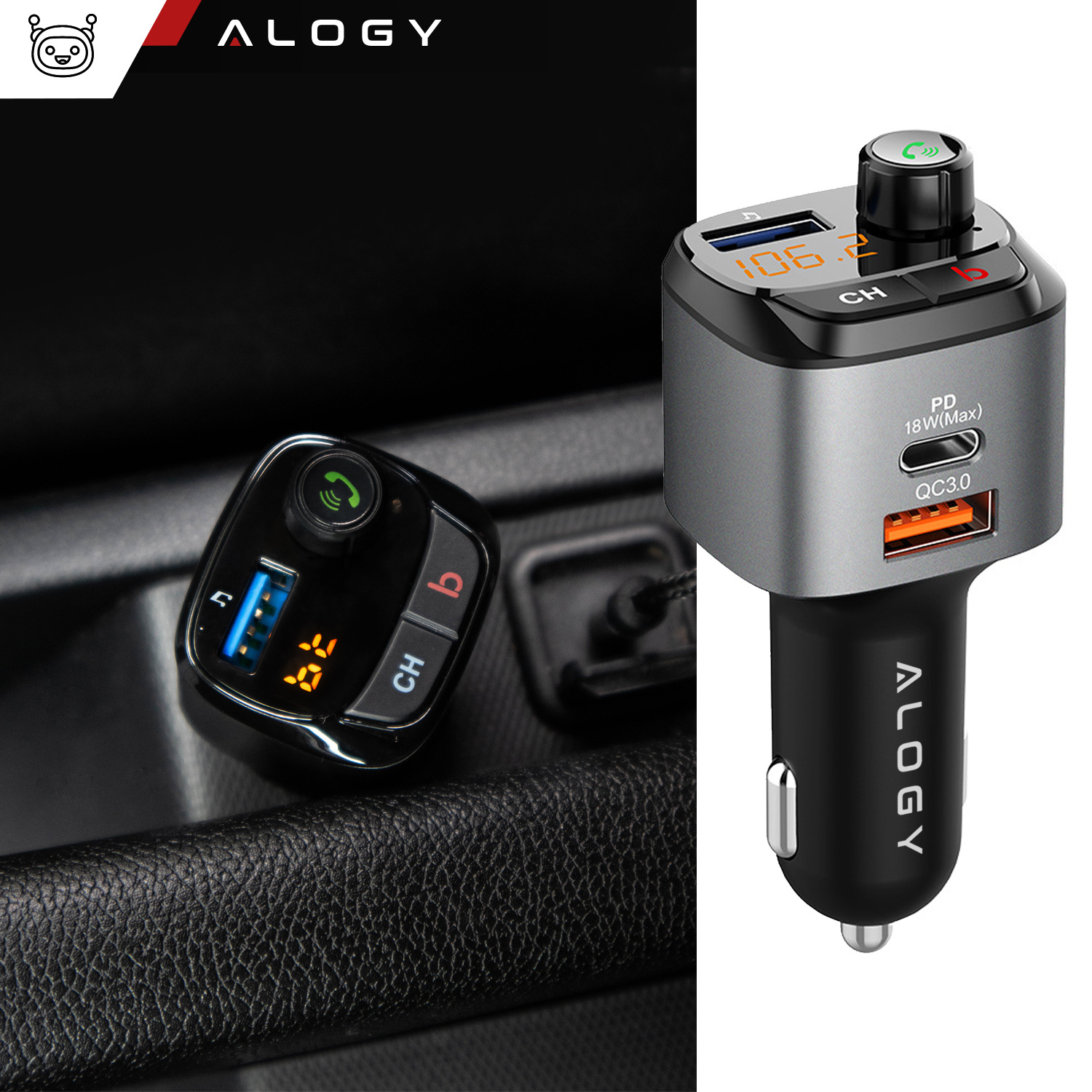 Alogy Auto-FM-Transmitter, USB-Ladegerät, QC 3.0, USB-C PD, Bluetooth-MP3-Player, 1 m Kabel, USB-C auf Lightning-Gehäuse