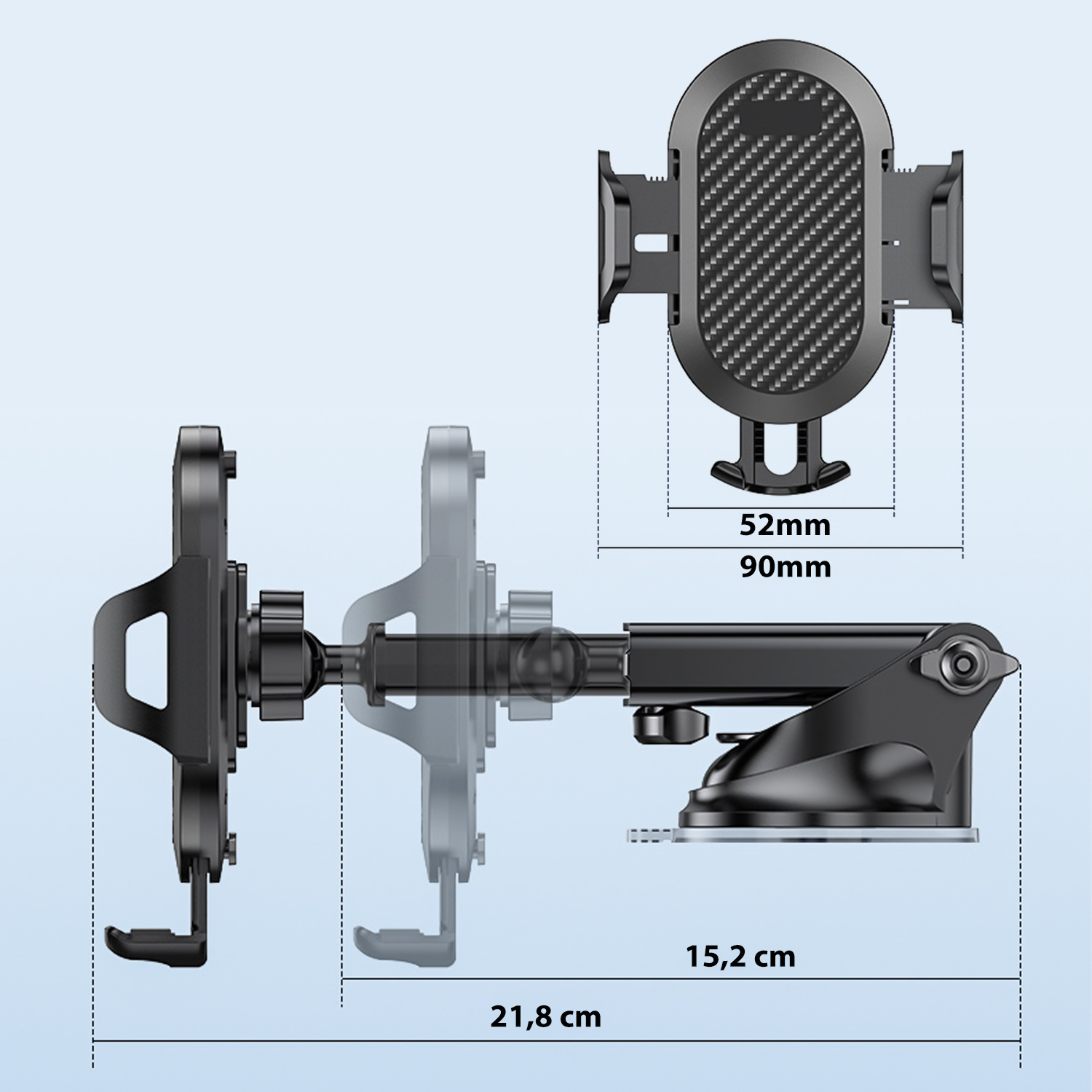 Der Autohalter besteht aus Materialien höchster Qualität, wodurch seine Struktur stabil und der Halt sicher ist. Die Anti-Rutsch-Ausrüstung sorgt für einen noch wirksameren Schutz vor dem Herausrutschen des Telefons. Der Halter verfügt über verstellbare Arme , die sich an die Größe des Telefons anpassen.