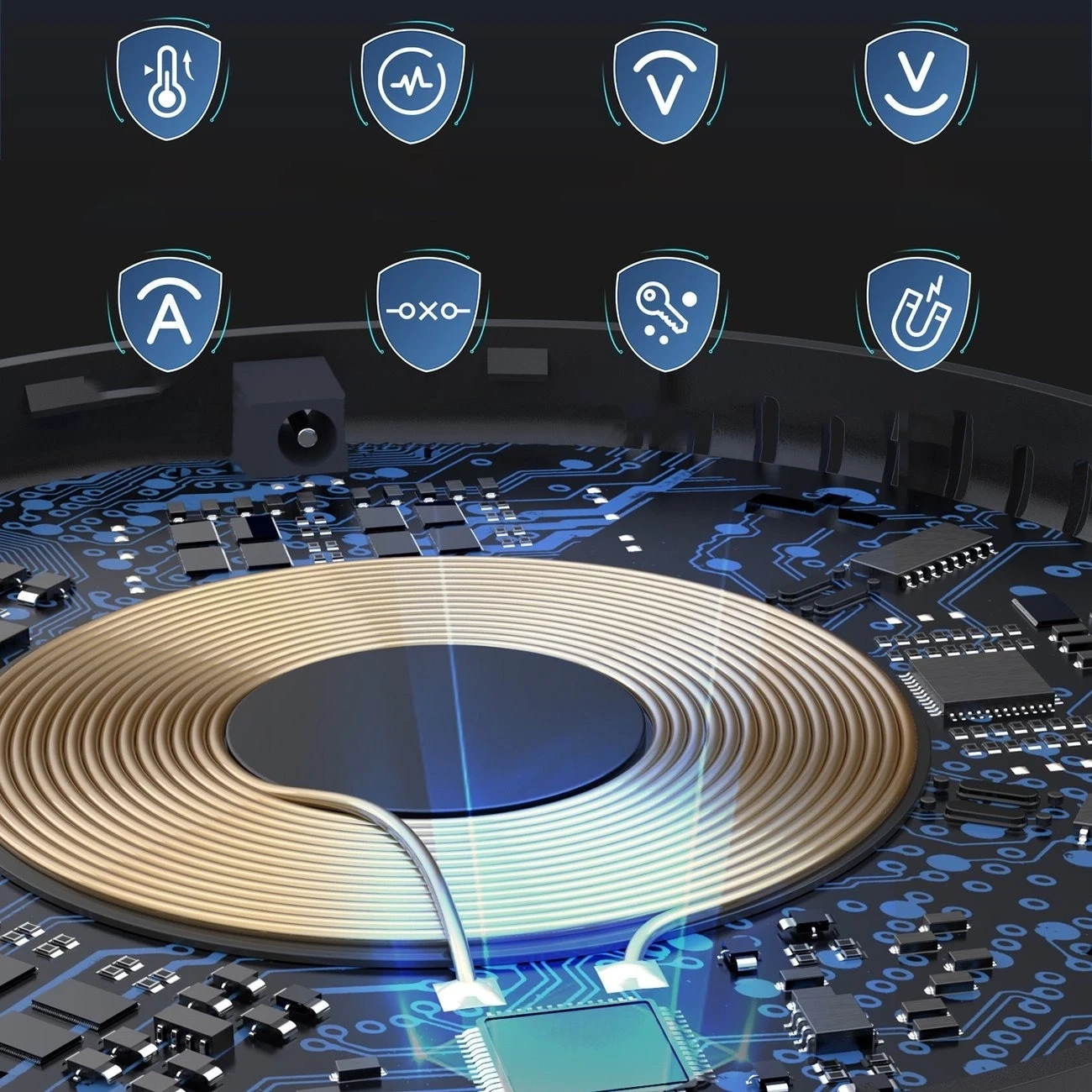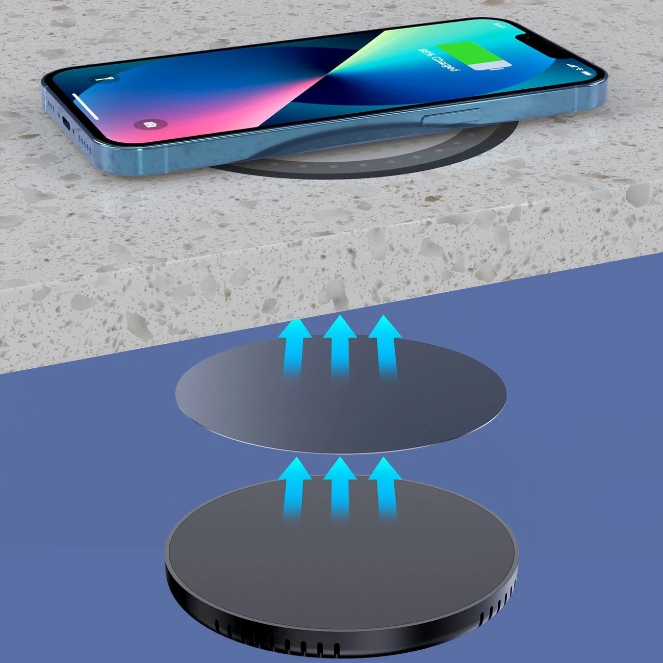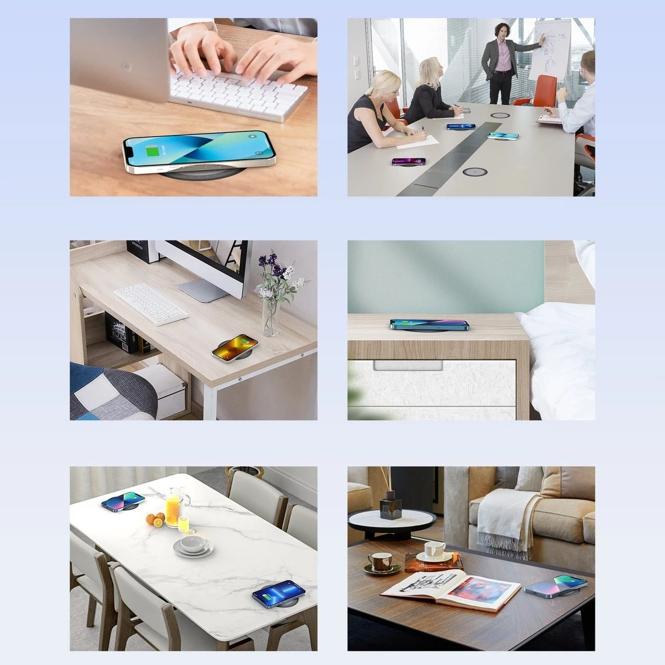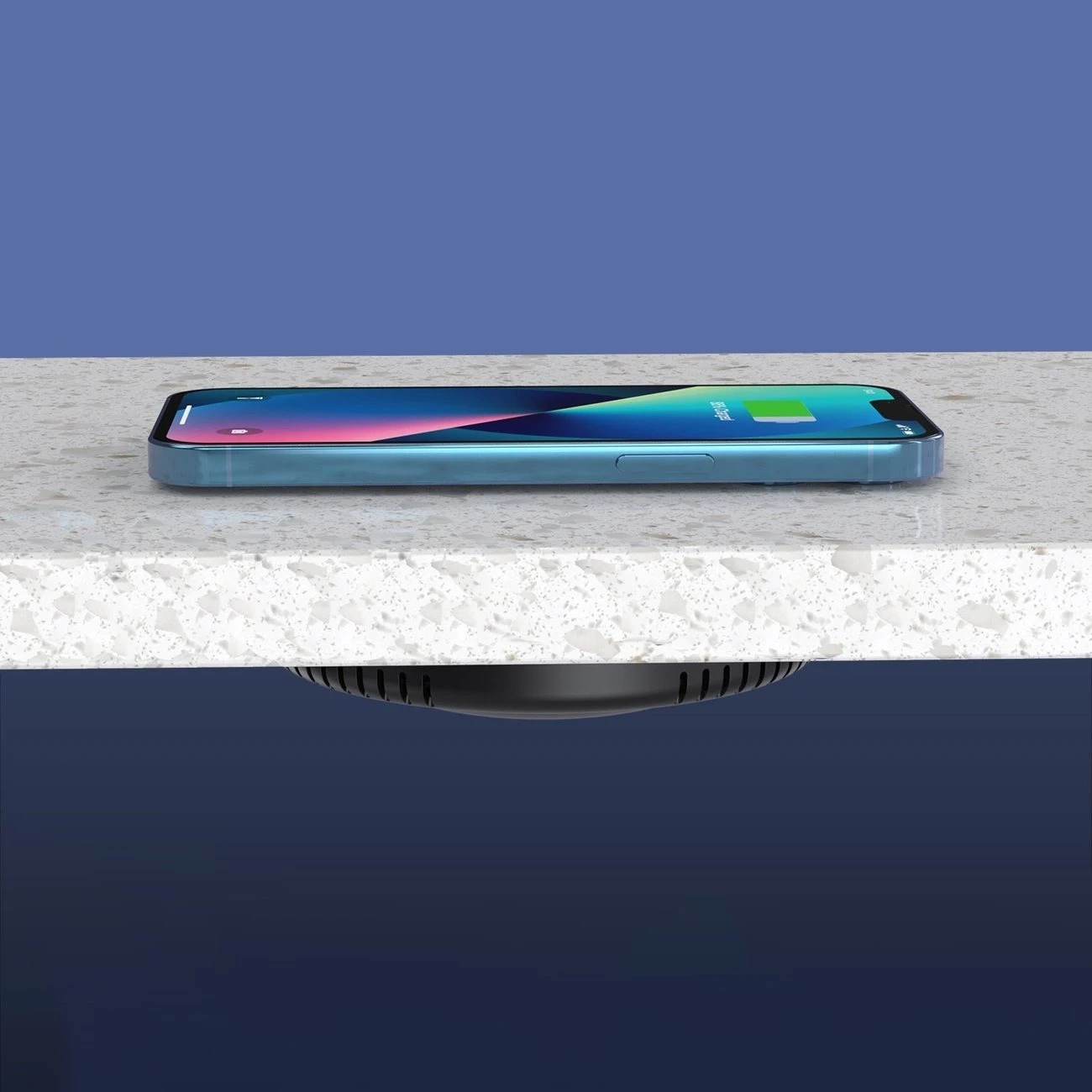 Choetech T590-F ist ein modernes Untertisch- Induktionsladegerät , das für die drahtlose Energieerneuerung entwickelt wurde . Hergestellt aus hochwertigen Materialien, funktionales Gerät , ausgestattet mit einem intelligenten Managementsystem, das die Ausrüstung vor Überspannung, Überladung oder Überhitzung schützt. Letzteres wird auch durch eine Reihe von Belüftungslöchern geschützt, die sich an der Unterseite des Zubehörs befinden. Das Ladegerät ist für die Montage unter einer Tischplatte, z.B. einem Schreibtisch (max. Dicke 3 cm), mit 3M-Klebeband oder zwei Schrauben (Zubehör im Lieferumfang enthalten) vorgesehen. Dank des im Set enthaltenen Sensors können Sie die korrekte Position des unter der Tischplatte montierten Ladegeräts perfekt anzeigen. Der größte Vorteil dieser Lösung ist das Fehlen eines weiteren Geräts und Kabel auf der Arbeitsplatte!