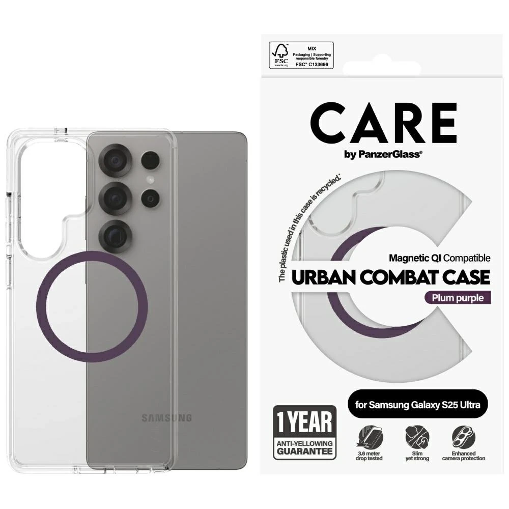 Das CARE by PanzerGlass Urban Combat Case für das Samsung Galaxy S25 Ultra in Flagship Purple vereint extremen Schutz mit minimalistischem Stil. Dieses transparente Case mit dem markanten lila Qi-Ring ist für Nutzer konzipiert, die keine Kompromisse eingehen.