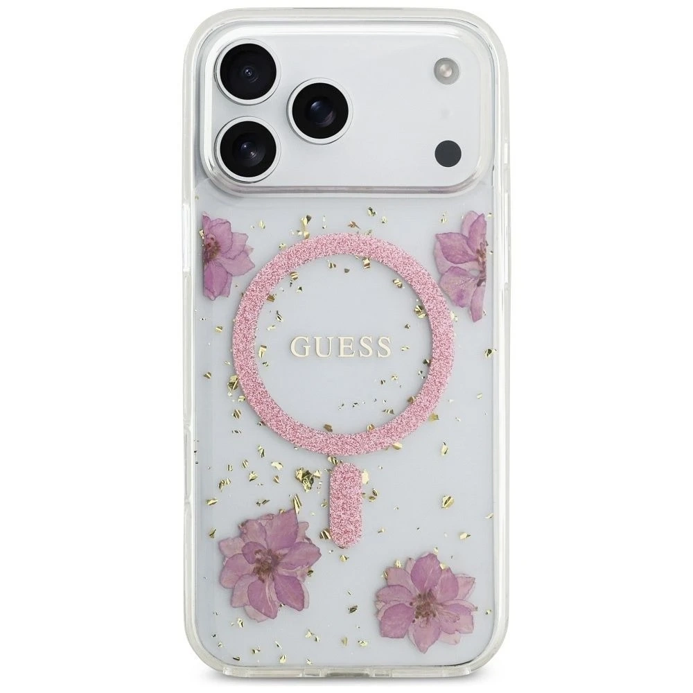Etui Guess Resin Flowers Glitter MagSafe do iPhone 17 Pro Max to połączenie elegancji i niezawodnej ochrony. Wyróżnia się wyjątkowym designem – różowy kolor, kwiecisty wzór i złote drobinki brokatu tworzą unikalny efekt wizualny, który podkreśla prestiż telefonu. Logo Guess w centralnej części oraz brokatowy pierścień MagSafe nadają etui luksusowego charakteru i przyciągają spojrzenia.