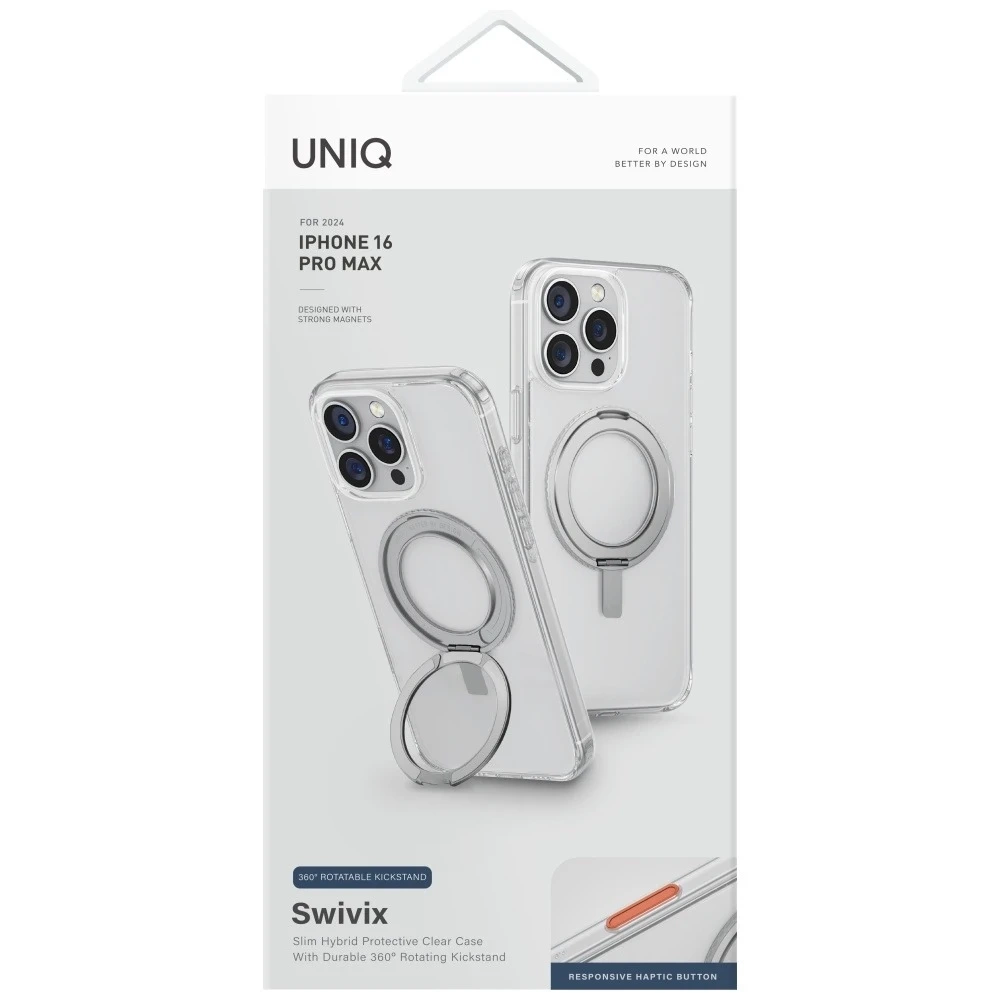 Entdecken Sie die UNIQ Swivix 360 Drehbare Schutzhülle mit integriertem Ständer in transparenter Ausführung, speziell für iPhone 16 Pro Max (6,9"). Die transparente Hülle unterstreicht dezent das einzigartige Design Ihres Smartphones und bietet gleichzeitig optimalen Schutz und praktische Funktionen.