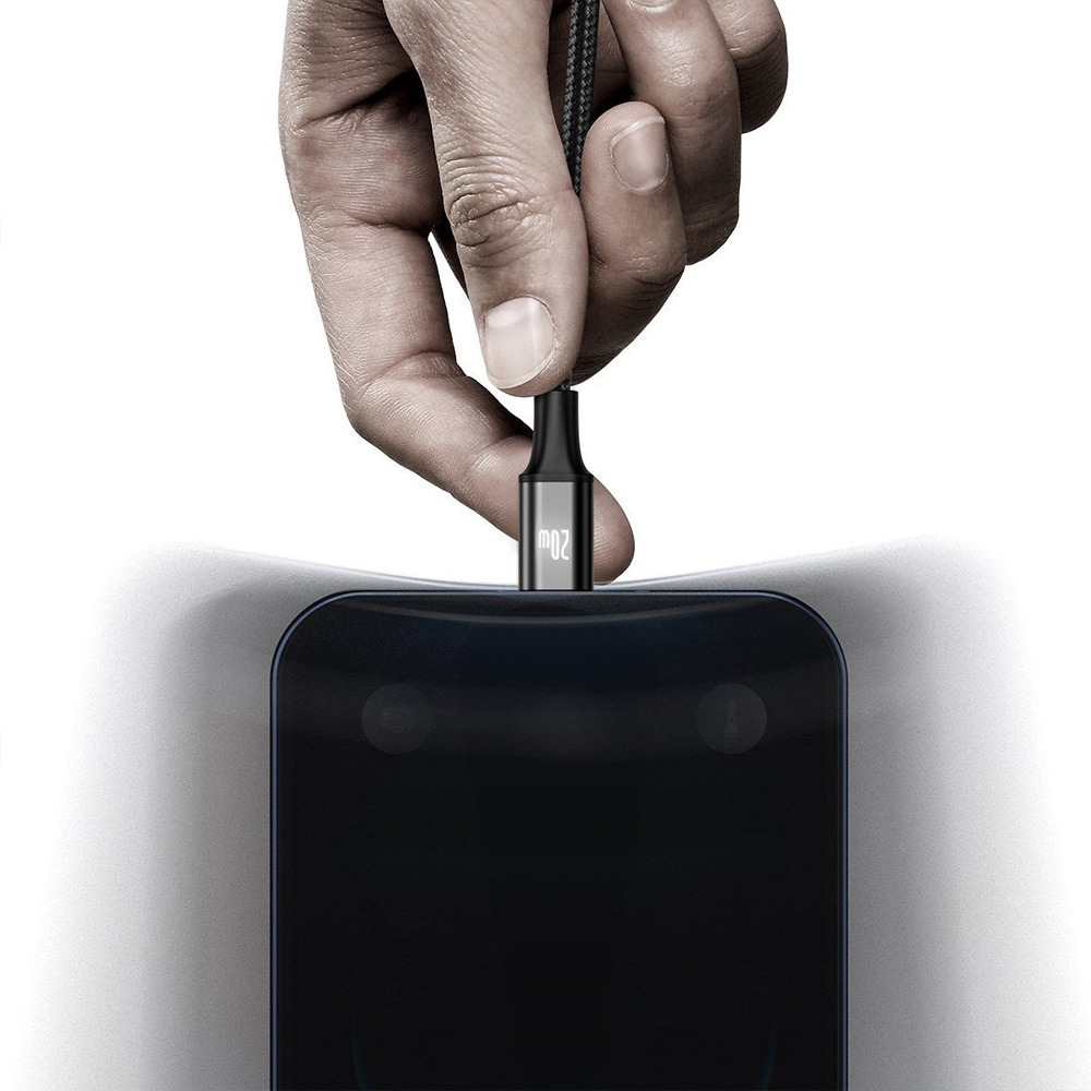 Das Kabel von Baseus aus der Rapid Series Serie wurde aus hochwertigsten Materialien gefertigt. Es verfügt über einen USB-C-Typ-C-Eingangsanschluss und bis zu 3 Ausgangsanschlüsse: USB-C-Typ-C, Micro-USB und Lightning. Es unterstützt das 20-W-Schnellladen, wodurch wir den Akku im Gerät in kurzer Zeit erneuern.