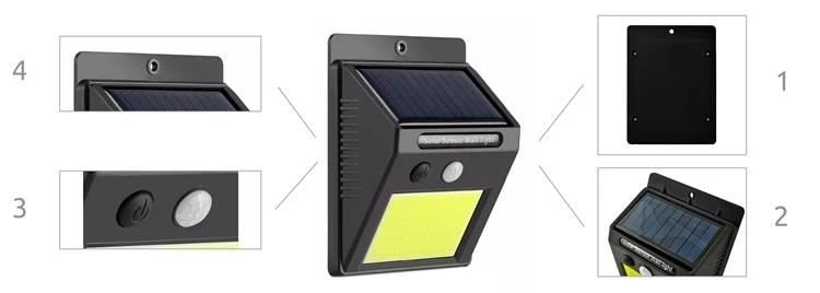 • Solar-LED-Außenleuchte mit Bewegungs- und Dämmerungssensor 48 LED COB ist aus hochwertigen Materialien gefertigt. Solarbetriebene LED-Leuchte, ideal geeignet für Haus- oder Garagenfront.