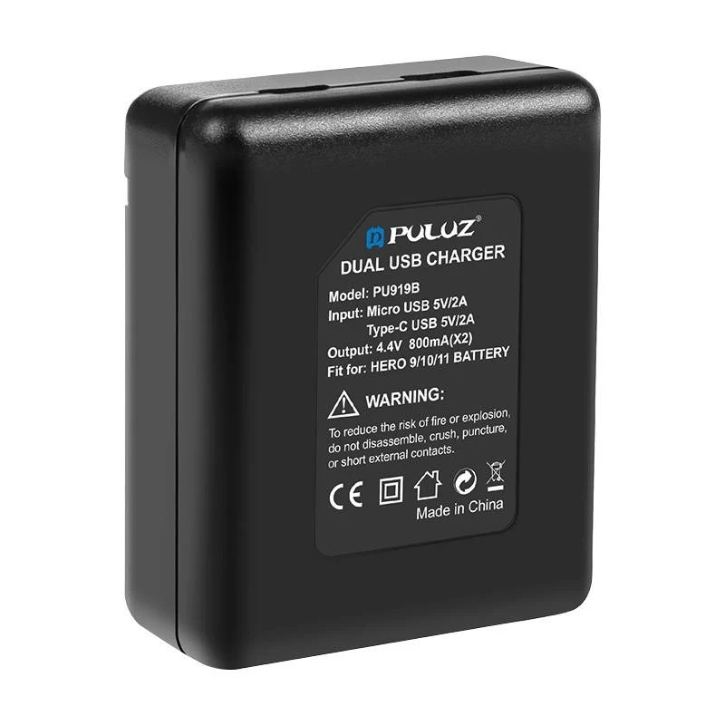 Marke Puluz Modell PU919B Farbe Schwarz Abmessungen 5,8 x 4,8 x 2 cm Schnittstellen Micro USB, USB-C Eingangsspannung Micro USB 5V/2A, USB-C 5V/2A Ausgangsspannung 4,4V 800mA Kompatibilität HERO 9/10/11