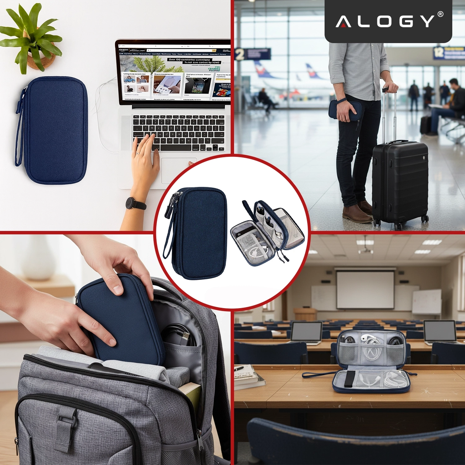Reiseetui mit Organizer für Kabel, Ladegeräte, Handy und Powerbank, multifunktional und kompakt (21 x 12,5 x 5 cm), Alogy TravelPack™ – Marineblau