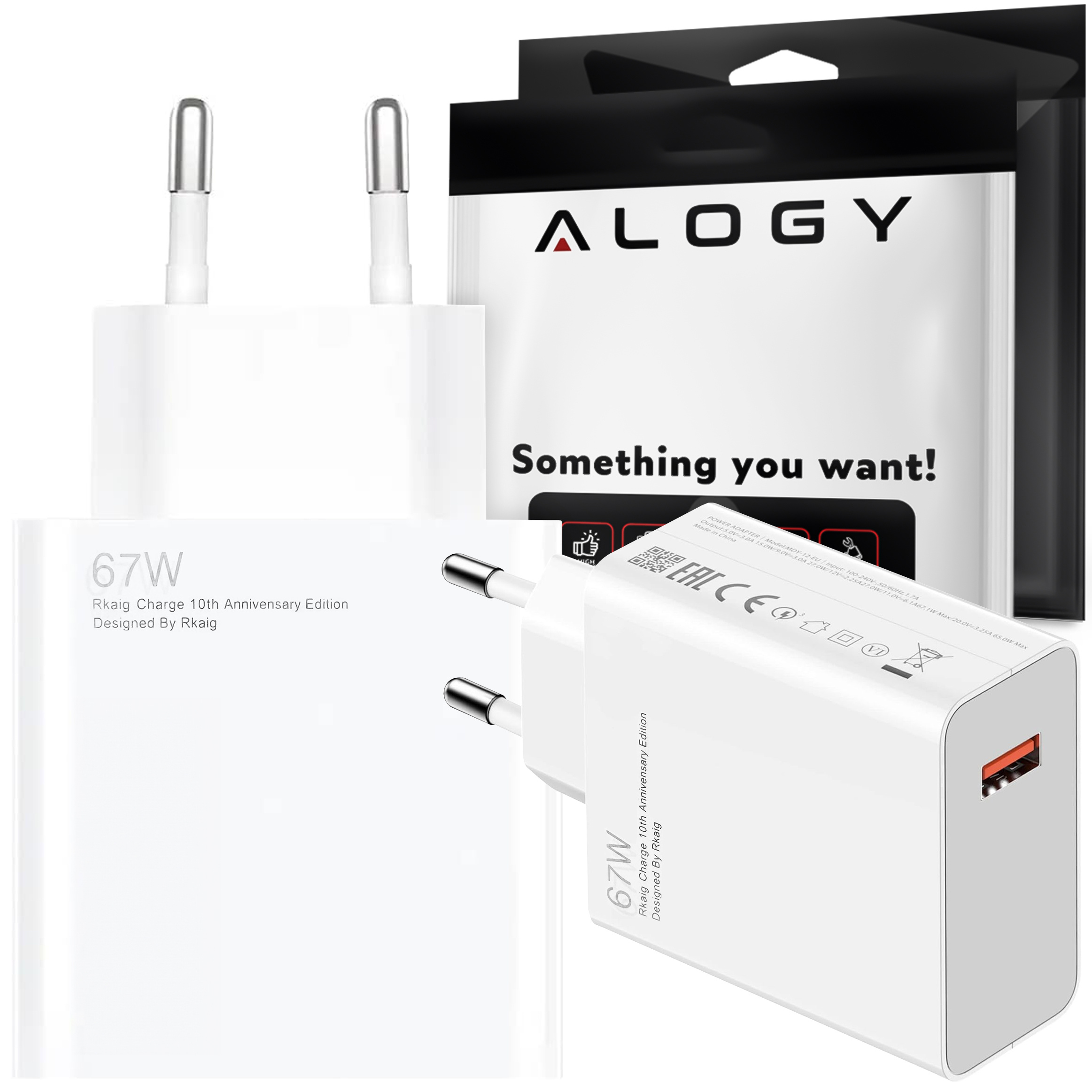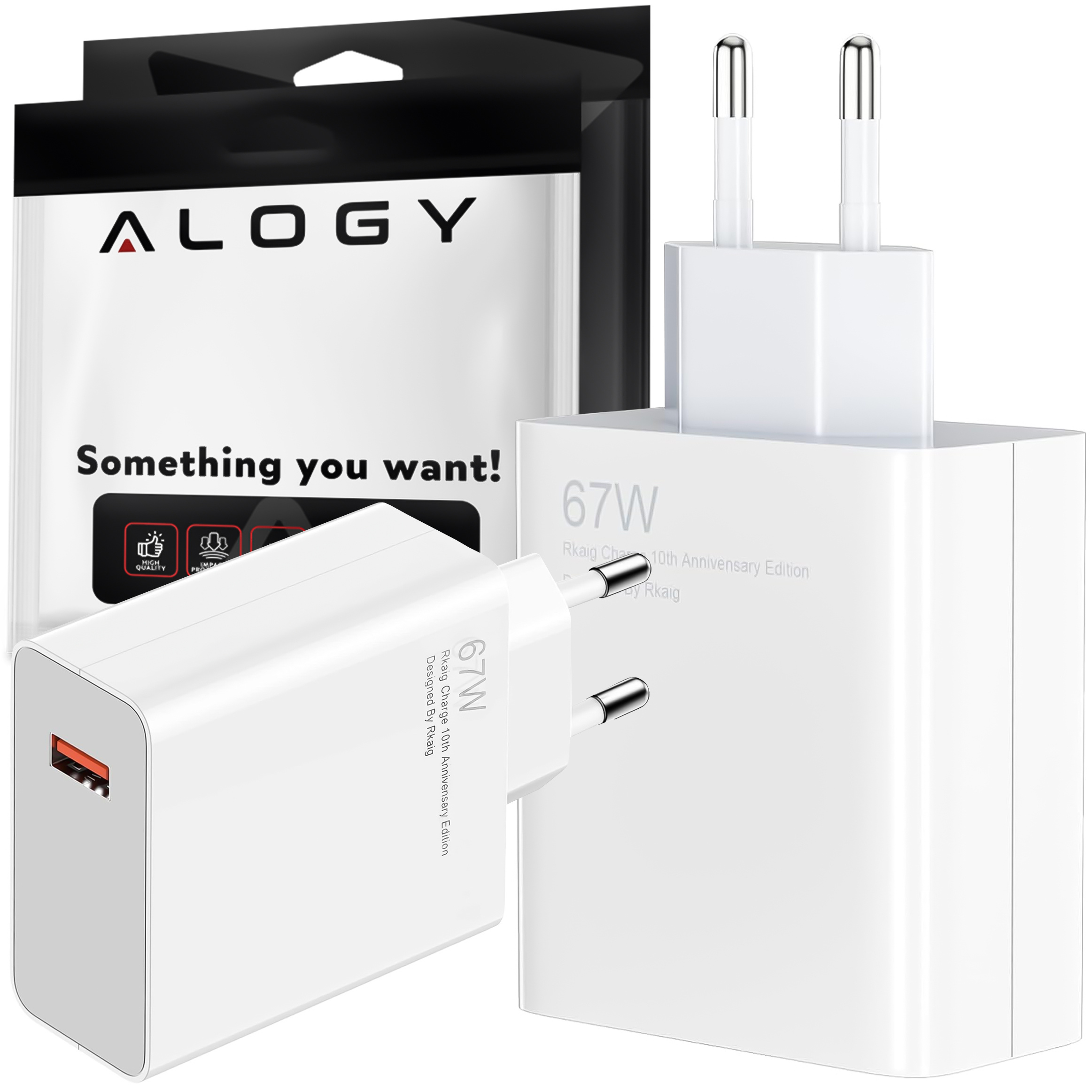 Die wichtigsten Merkmale des Alogy-Wandladegeräts sind seine Leistung von 67 W, das Material (PC), die Kompatibilität mit iOS- und Android-Geräten, EAC- und CE-Zertifikate sowie die Unterstützung von Schnellladeprotokollen.
