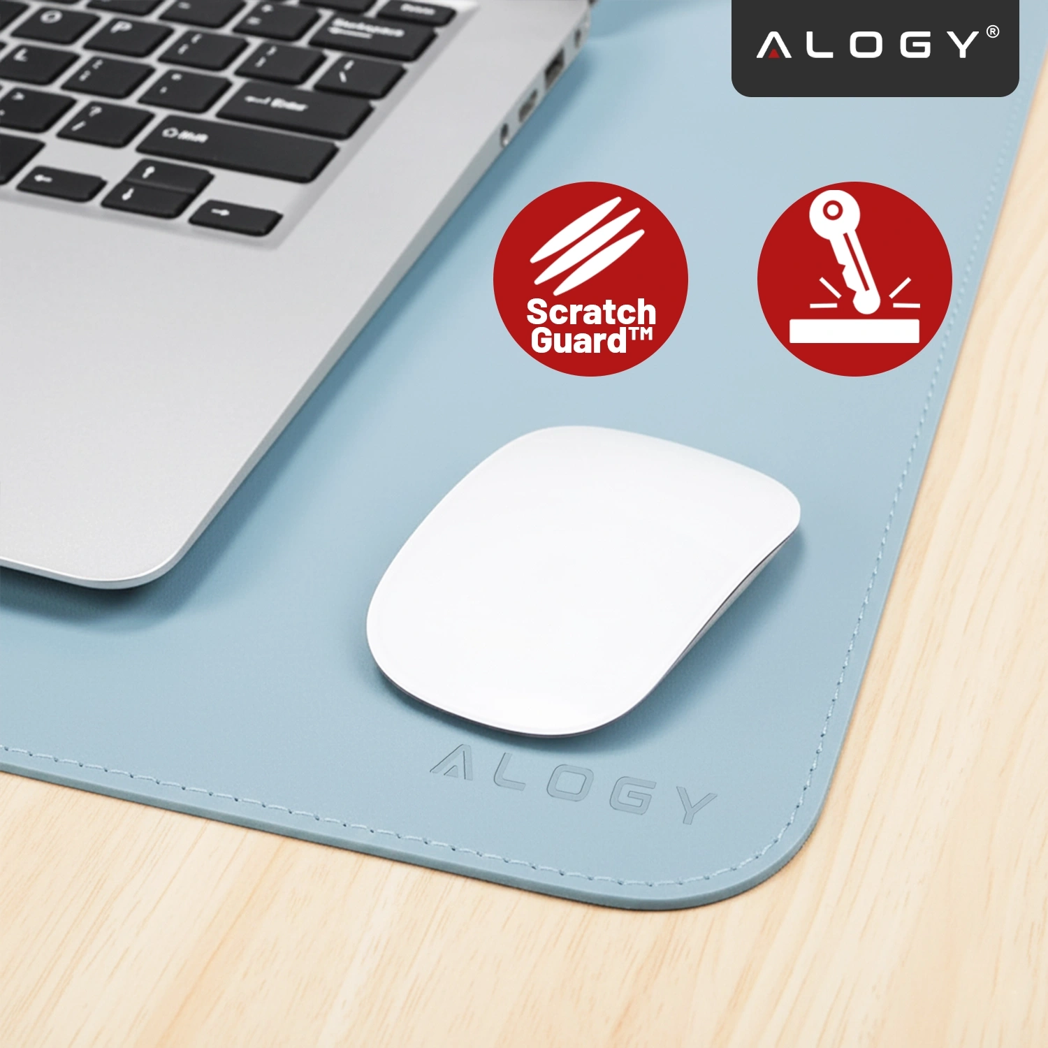 • Das blaue, wasserfeste Alogy WorkMat™ Mauspad (100 x 50 cm) aus PU-Leder schützt Ihren Schreibtisch vor Kratzern und Flüssigkeiten. Seine glatte Oberfläche ersetzt Maus- und Tastaturunterlage. Vernähte Kanten sorgen für Langlebigkeit und ein elegantes Aus