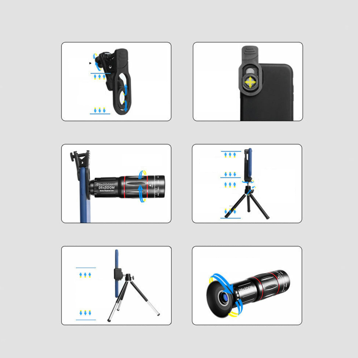 - Produkttyp: Telefon-Monokularobjektiv mit Telefonhalter und Mini-Stativ