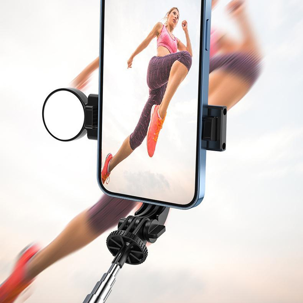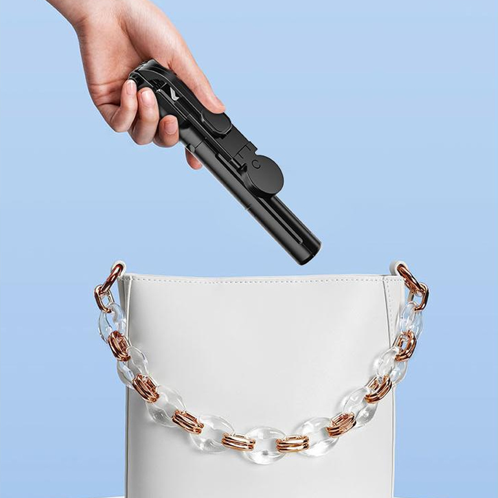 Selfie-Stick mit Bluetooth-Fernbedienung und Stativfunktion ist ein Produkt aus Materialien, die eine lange Lebensdauer und Sicherheit garantieren. Die eingebaute Lampe im Griff ermöglicht es Ihnen, den Rahmen zu beleuchten und so eine bessere Fotoqualität zu gewährleisten.
