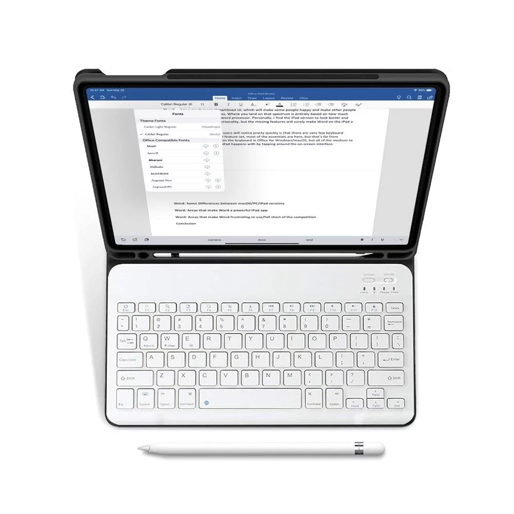 Ein zusätzlicher Vorteil ist die magnetische, kabellose Bluetooth-Tastatur, deren Lebensdauer bis zu 140 Stunden ununterbrochenes Arbeiten beträgt.