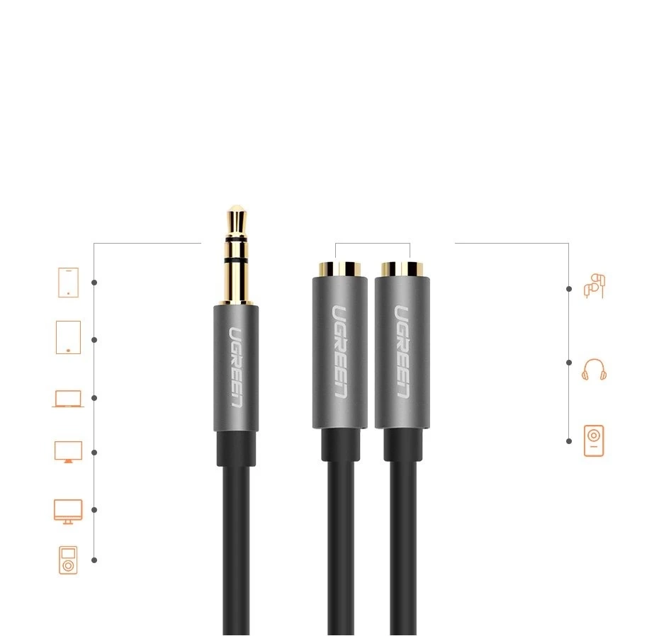 Der Kopfhörer -Splitter von Ugreen ist ein praktisches 20 cm langes Kabel, mit dem Sie Musik hören oder Filme von z.B. einem Telefon auf zwei Kopfhörern ansehen können. Es ist mit allen Geräten kompatibel, die über eine 3,5-mm-Miniklinke verfügen.