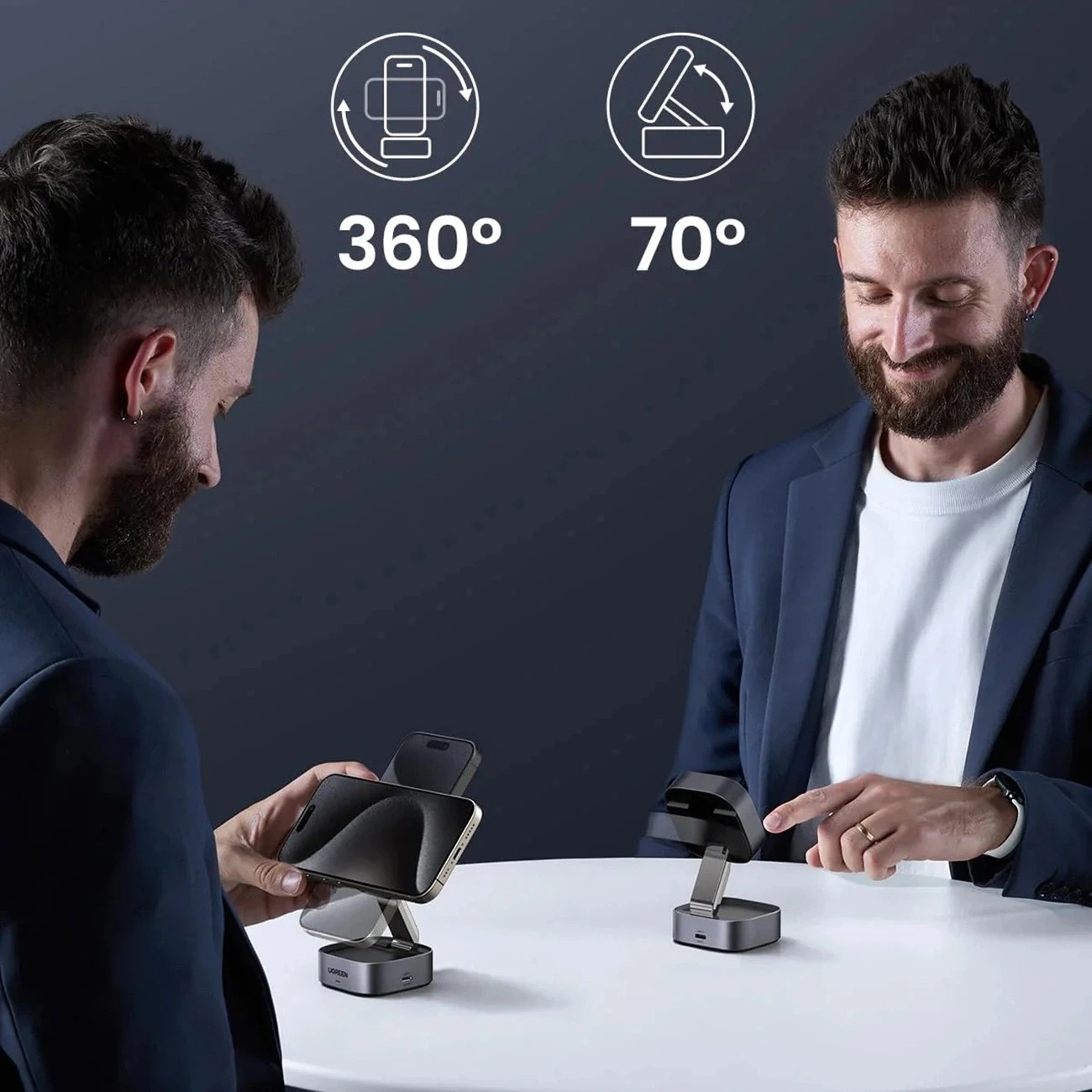 Vergessen Sie Kabelsalat und langsames Laden. Das induktive Ladegerät Ugreen W702 kombiniert elegantes Design, 3-in-1-Vielseitigkeit und die neuesten Technologien wie MagSafe™ und Qi2™ und ermöglicht schnelles, kabelloses Laden für iPhone, Kopfhörer und Uhr – gleichzeitig.