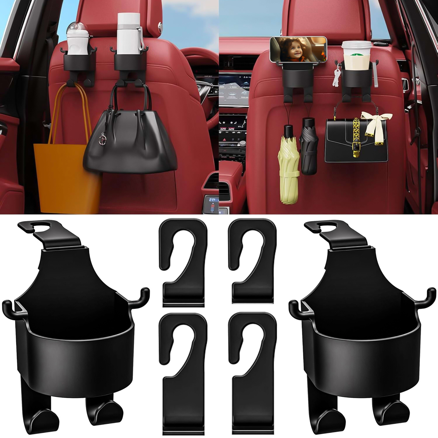 - Contents: 2x Headrest hanging bracket, 4x hook