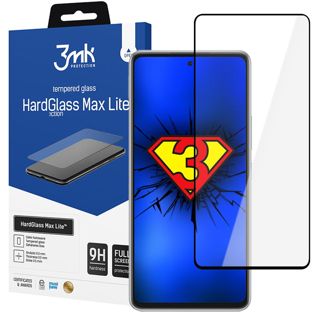 The original 3mk® tempered glass from the HardGlass Max Lite series, dedicated to the Samsung Galaxy A53 5G , has been specially designed and profiled to cover the largest possible screen area of the device.