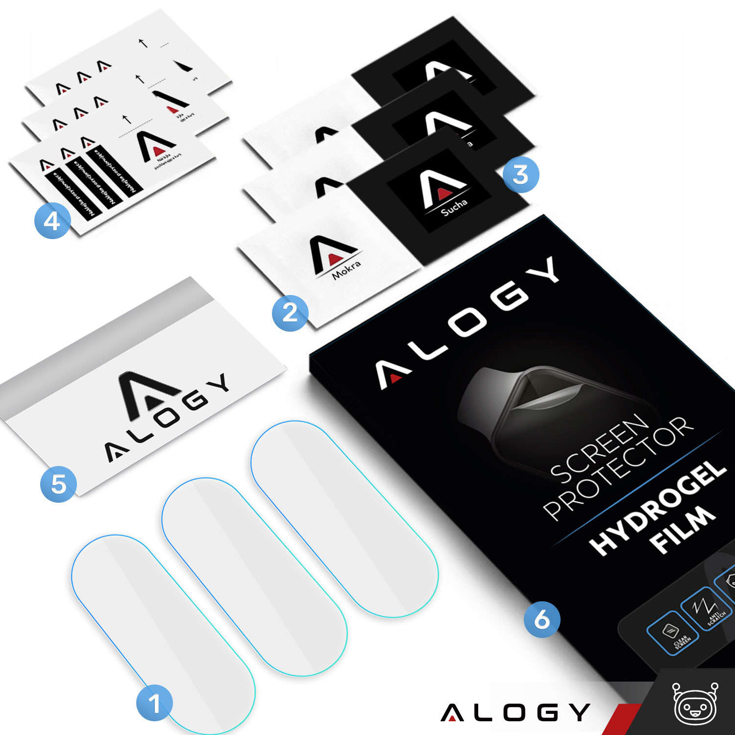 • Set includes: 3x Alogy hydrogel film, 3x wet cloth, 3x dry cloth, 3x Dust removal sticker set, 1x Squeegee