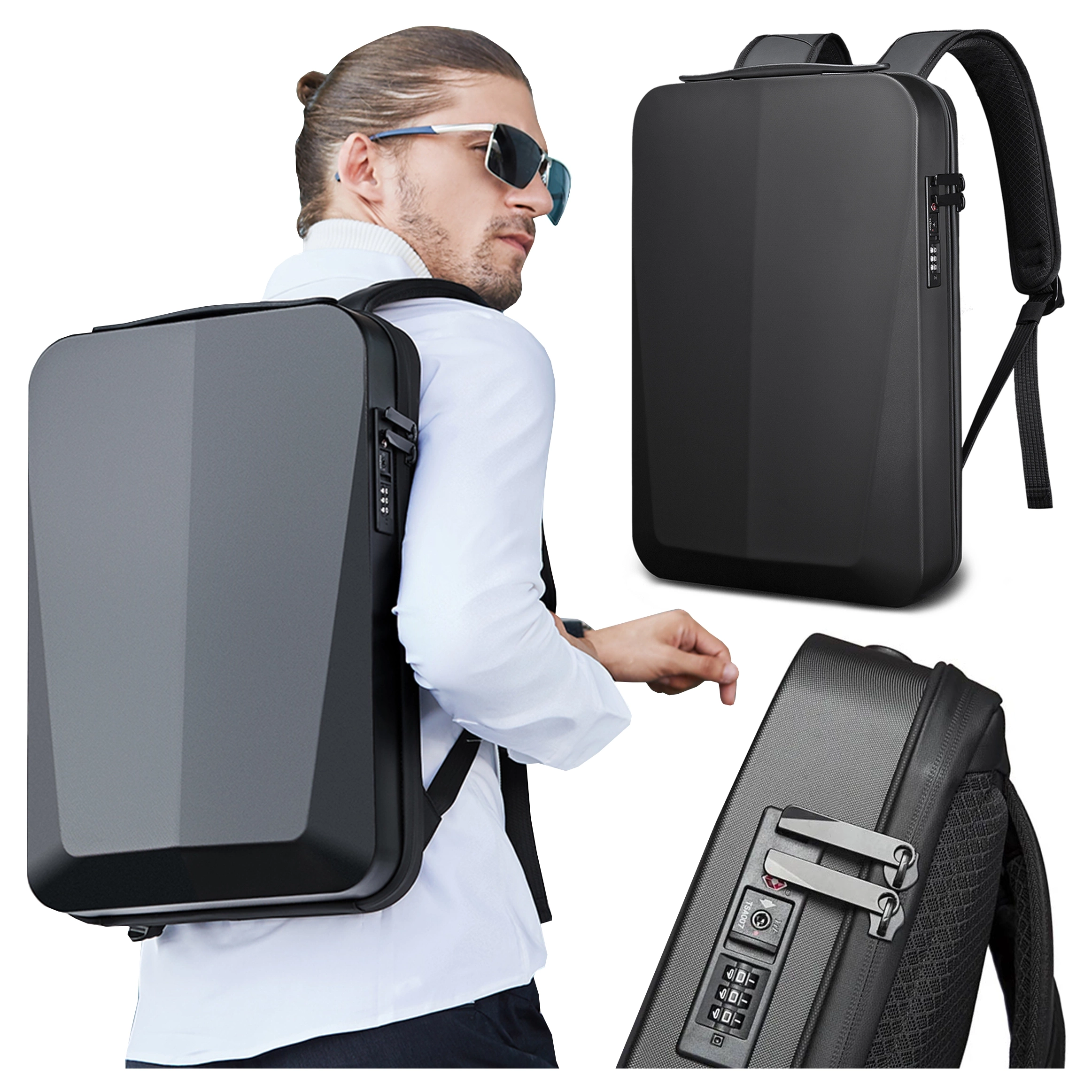 - Features: Opens like a suitcase, built-in USB port, adjustable shoulder straps, main compartment secured with a combination lock