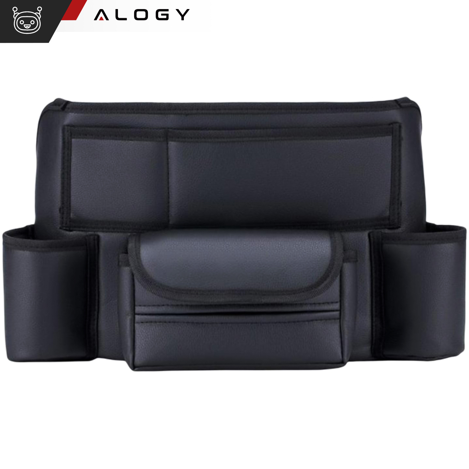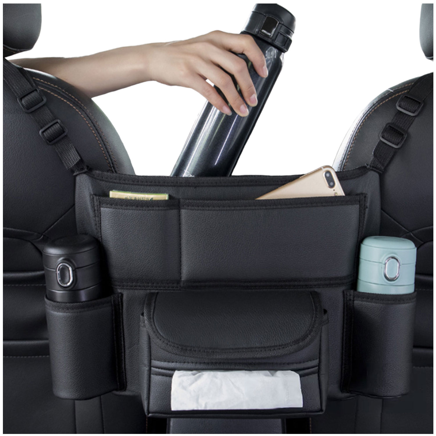 The organizer has two straps that should be attached to the driver's and passenger's headrest. Additionally, two elastic straps, ended with a plastic buckle, located in the back the organizer parts should be pulled between the front seats and the armrest and inserted into the seat slot.
