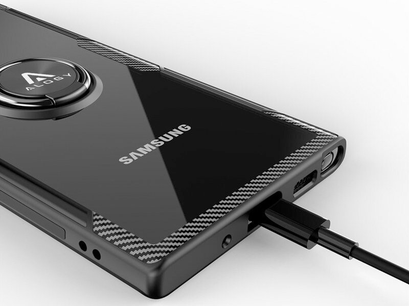 The Alogy ring holder case for Samsung Galaxy Note 20 is a product made of a combination of two high-quality materials; flexible TPU and durable polycarbonate. Flexible and resistant TPU is used in the frame of the Samsung Galaxy Note 20 case to make its assembly even easier. In addition, the TPU has an airbag system in each corner, which is responsible for cushioning during unexpected falls. The housing, thanks to its strong and durable construction, effectively protects the smartphone against unwanted damage and absorbs the impact force caused by a fall from a small height. To increase the attractiveness, the case has carbon decorations similar to carbon fiber.