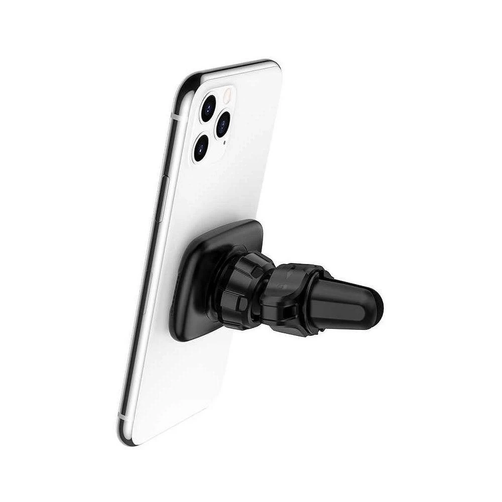 HOCO brand magnetic holder. Allows you to safely use your smartphone while driving. It is extremely universal, allowing you to operate almost every device on the market. Built-in magnets (6 pieces) provide a secure grip, preventing the smartphone from falling out of the holder. The special design allows for easy installation in the air vent. Made of lightweight, solid materials, it ensures comfortable and safe use. The grille mount is screwed, which ensures secure installation in the grille. The mounts on the side of the holder allow you to attach the cable. 360-degree rotation allows you to adjust the product parameters to the device being operated. Specification: Material: PC, ABS, silicone Size: 75 x 57 x 43 mm Weight: 66 g Load range: 2 kg Mounting location: air outlet grille