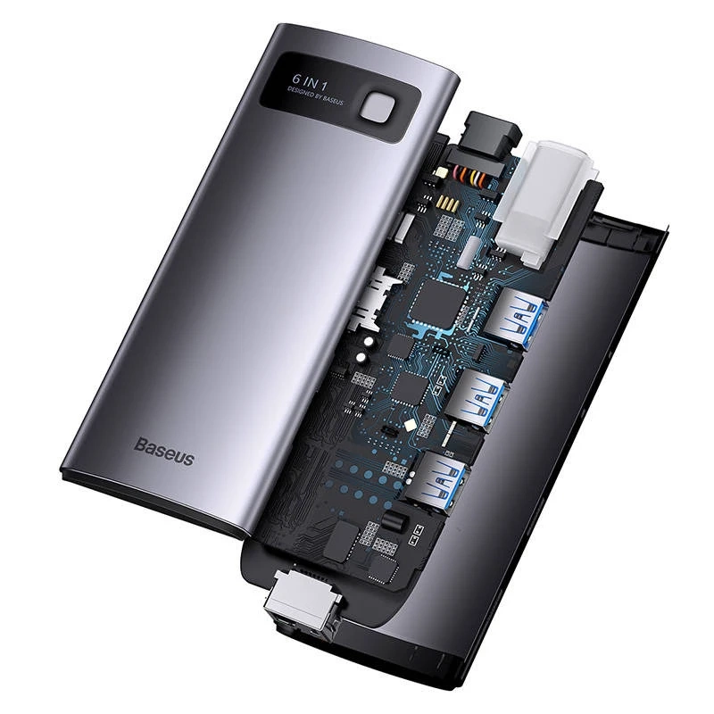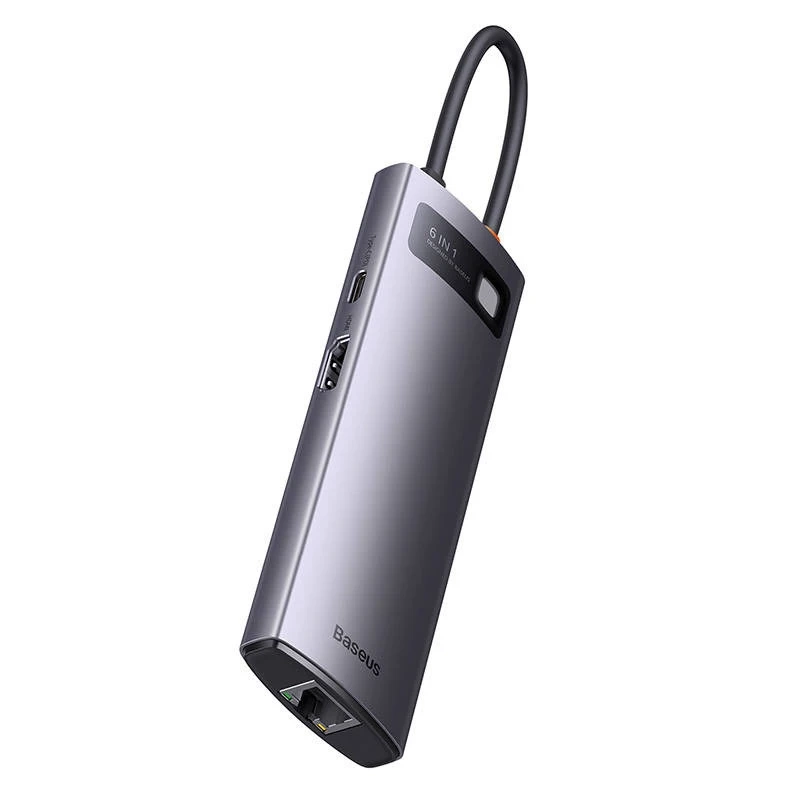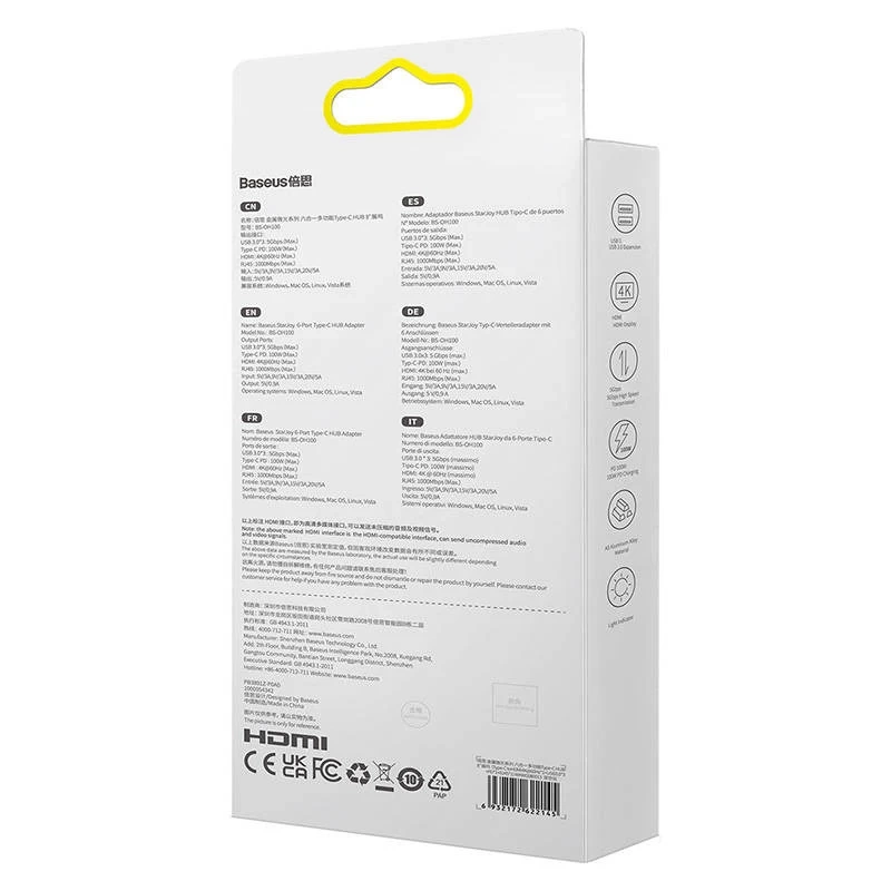 • The Baseus StarJoy Series 6-in-1 hub, USB-C to HDMI 3 x USB 3.0 USB-C PD RJ45 is equipped with 6 ports, thanks to which you can connect a number of different devices to it. What's more, it offers lightning-fast data transfer and image in 4K@60 Hz resoluti
