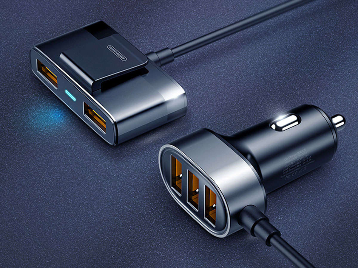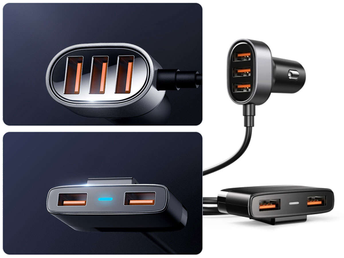 The JoyRoom car charger is a high-quality device that allows you to charge up to 5 devices at the same time. The charger has 5x USB connectors, three of which are in the plug, and the other two on an additional cube (extension cable), so you can simultaneously charge devices both in the front and in the back of the vehicle.