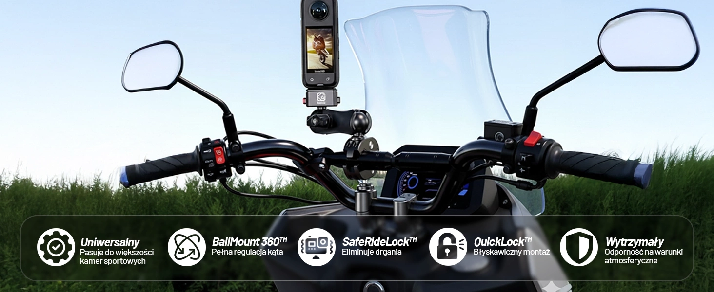 ✅ That's where KEWIG comes in – a professional motorcycle mount for 360-degree action cameras . Thanks to the SafeRideLock™ anti-vibration lock and the fully adjustable BallMount 360™, you'll capture stable, smooth footage regardless of speed or terrain. The durable 6061 aluminum alloy construction guarantees reliability even in the harshest conditions – from riding in the rain to sharp turns on the track.